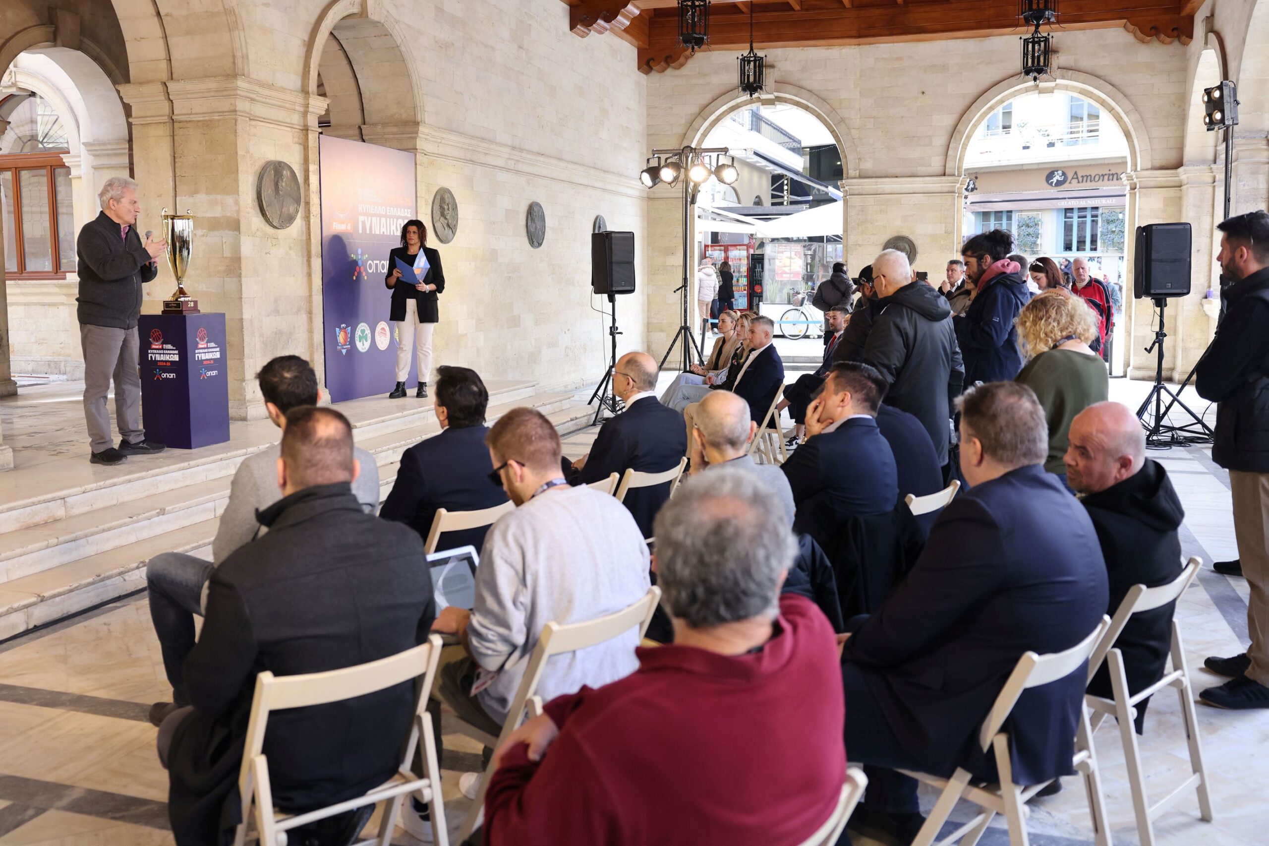 Στο πλαίσιο της εκδήλωσης, ο Δήμαρχος Ηρακλείου Αλέξης Καλοκαιρινός μίλησε για την εδραιωμένη συνεργασία μεταξύ της Ε.Ο.Κ., του Δήμου Ηρακλείου και της Περιφέρειας Κρήτης για την φιλοξενία διοργανώσεων αυτού του βεληνεκούς. «Έχουμε δημιουργήσει μια παράδοση συνέργειας με την Ε.Ο.Κ. και με την Περιφέρεια Κρήτης σε αυτές τις διοργανώσεις, και νομίζω ότι αξιοποιούμε ένα δυναμικό το οποίο είναι κατάλληλο πράγματι για το επίπεδο αυτών των οργανώσεων. Έχουμε τις αθλητικές υποδομές αλλά έχουμε και το περιβάλλον που έχει να κάνει με τη γενικότερη υποστήριξη. Μπορούμε να υποδεχθούμε όχι μόνο τις ομάδες αλλά και πολλούς φιλάθλους» τόνισε ο Δήμαρχος Ηρακλείου και συμπλήρωσε ότι: «Έχουμε βέβαια και ένα ευρύτερο περιβάλλον που είναι και μιας φυσικής ομορφιάς αλλά και με την ιστορική βαρύτητα που έχει και ο χώρος στον οποίο βρισκόμαστε. Εδώ είμαστε στην ενετική Λότζια του 1620. Δεν έχουμε πάρα πολλές περιπτώσεις στην Ελλάδα τέτοιων κτιρίων που βρίσκονται σε δημόσια χρήση, πολύ κοντά σε μία σύγχρονη αθλητική υποδομή και με τη βοήθεια της Ε.Ο.Κ. τη φέρνουμε στις απαιτούμενες προδιαγραφές για να εξακολουθήσουν να φιλοξενούνται συστηματικά διοργανώσεις στο υψηλότερο επίπεδο. Εδώ επίσης έχουμε και τους πολλούς φιλάθλους οι οποίοι αγαπούν το άθλημα και θα βρεθούν γύρω σας τις επόμενες ημέρες.».