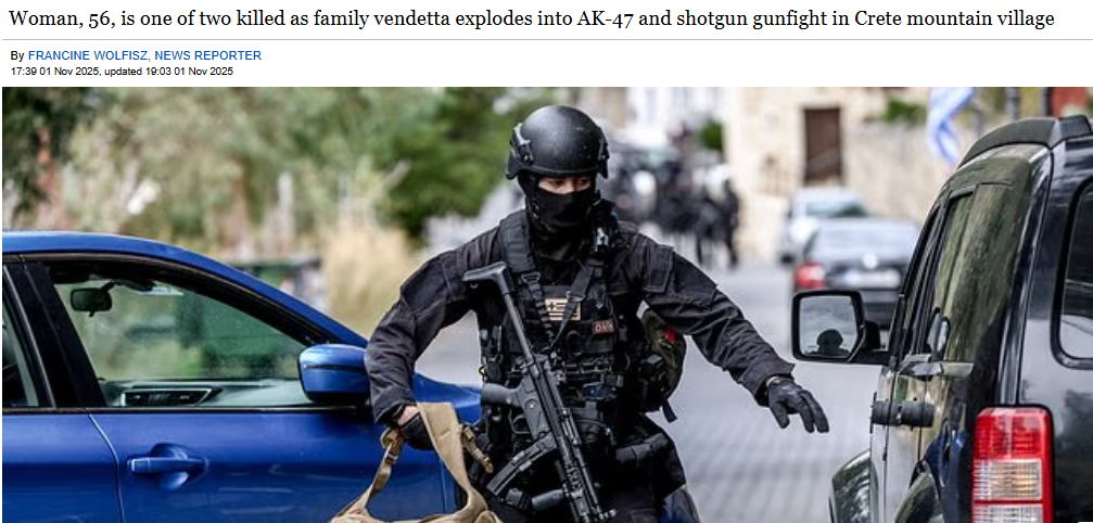 «Γυναίκα, 56 ετών, είναι μία από τους δύο νεκρούς, καθώς οικογενειακή βεντέτα εξελίσσεται σε ανταλλαγή πυροβολισμών με AK-47 και καραμπίνα σε ορεινό χωριό της Κρήτης».