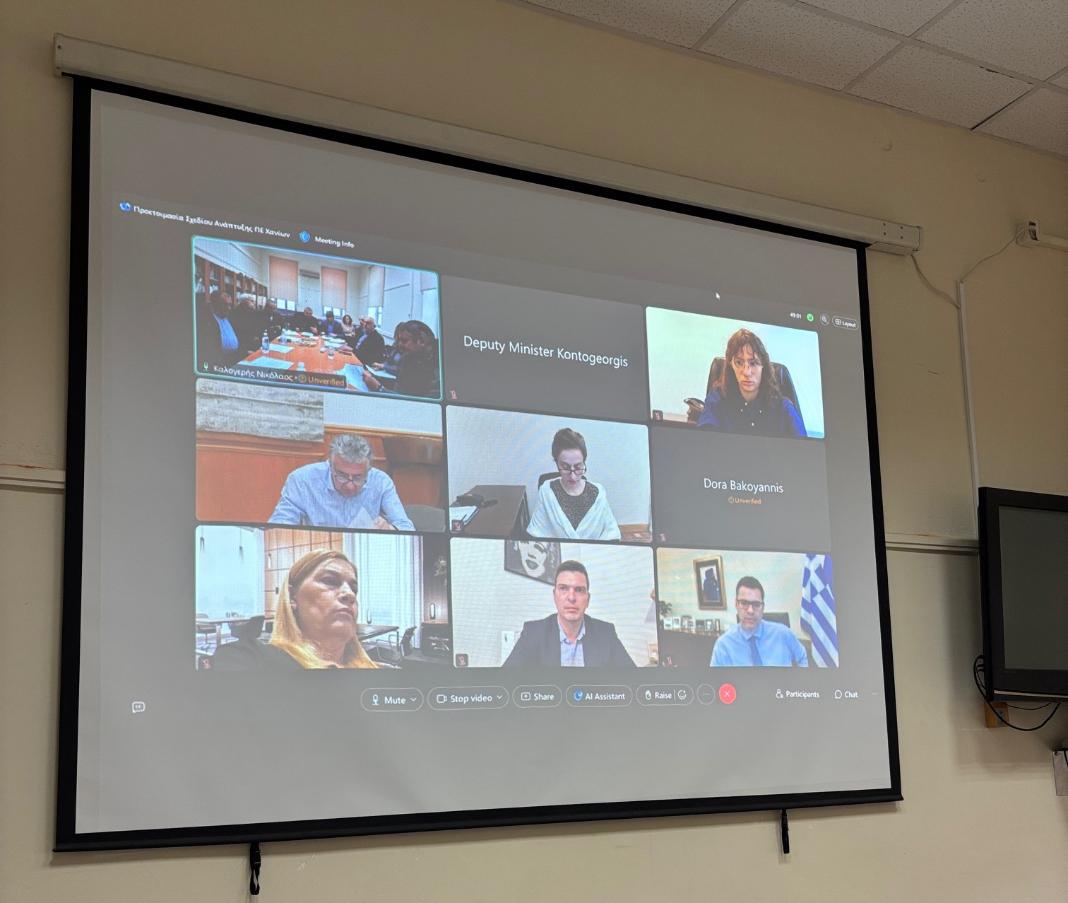 Τηλεδιάσκεψη με συντονιστή τον Υφυπουργό στον Πρωθυπουργό κ. Θανάση Κοντογεώργη, για την προετοιμασία του Σχεδίου Ανάπτυξης της Περιφερειακής Ενότητας Χανίων πραγματοποιήθηκε την Τετάρτη 3 Δεκεμβρίου 2025 στην Περιφερειακή Ενότητα Χανίων.