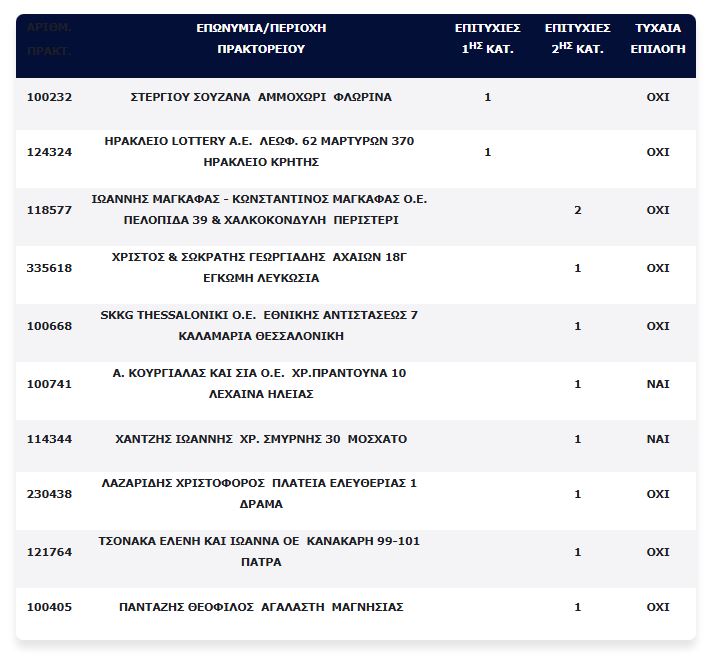 Επίσης, εννιά τυχερά δελτία βρέθηκαν στη 2η κατηγορία (5), τα οποία κερδίζουν το ποσό των €100.000,00 για κάθε επιτυχία.