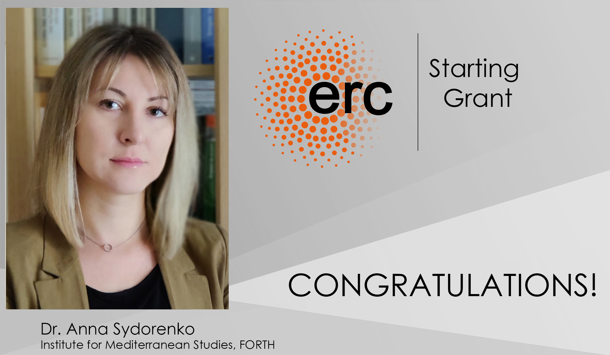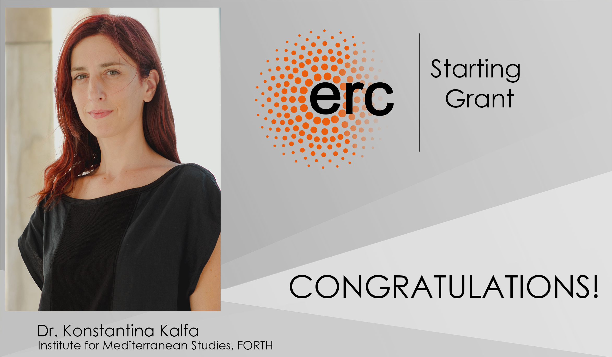 Σημαντικές επιχορηγήσεις από το Ευρωπαϊκό Συμβούλιο Έρευνας, ERC Starting Grants, συνολικού ποσού περίπου 3 εκ. ευρώ, έλαβαν οι μεταδιδακτορικές ερευνήτριες Δρ. Άννα (Γκάννα) Σιντορένκο και Δρ. Κωνσταντίνα Κάλφα, οι οποίες θα υλοποιήσουν την έρευνά τους στο Ινστιτούτο Μεσογειακών Σπουδών του Ιδρύματος Τεχνολογίας και Έρευνας. Αξίζει να σημειωθεί ότι από τα 494 έργα που χρηματοδοτήθηκαν, τα συγκεκριμένα δύο είναι τα μοναδικά ήρθαν στην Ελλάδα. Οι συγκεκριμένες χρηματοδοτήσεις του Ευρωπαϊκού Συμβουλίου Έρευνας είναι οι κορυφαίες της Ευρώπης και υποστηρίζουν νέους ερευνητές στην αρχή της καριέρας τους για να δημιουργήσουν τις δικές τους ερευνητικές ομάδες και να διεξάγουν πρωτοποριακή έρευνα σε όλους τους κλάδους.