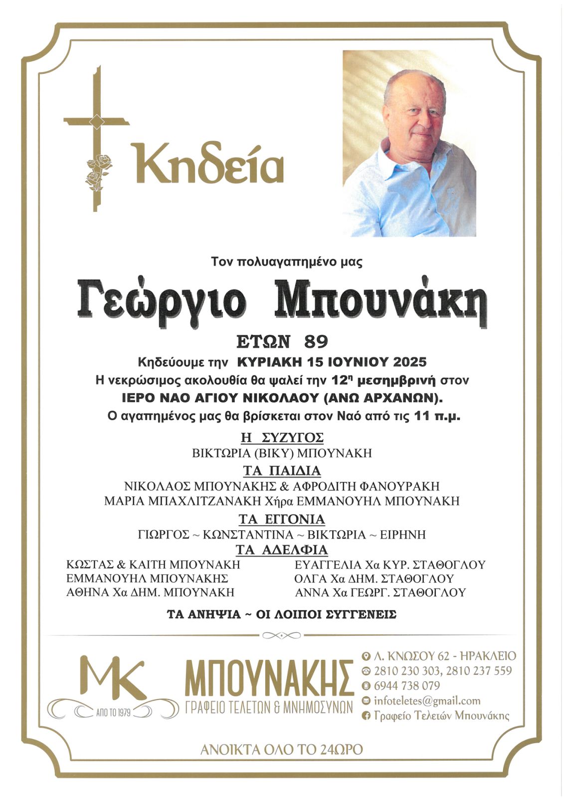 Συγγενείς και φίλοι θα πουν το τελευταίο αντίο στον Γιώργο Μπουνάκη αύριο Κυριακή 15 Ιουνίου, στον Ιερό Ναό Αγίου Γεωργίου Αρχανών, στις 12 το μεσημέρι.