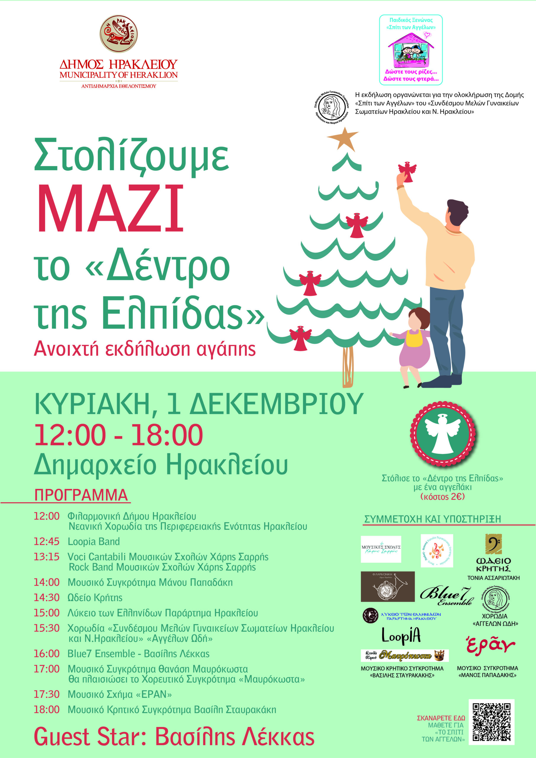 Την ημέρα του στολισμού του «Δέντρου της Ελπίδας» με επίτιμο προσκεκλημένο τον σπουδαίο ερμηνευτή Βασίλη Λέκκα με τους Blue7 Ensemble, οι συμμετέχοντες θα μπορούν αγοράζοντας ένα αγγελάκι συμβολικής αξίας 2 ευρώ, να στολίσουν το Δέντρο και να στηρίξουν με αυτό τον τρόπο το «Σπίτι των Αγγέλων». Ακόμα θα απολαύσουν ένα πλούσιο εορταστικό μουσικό πρόγραμμα σε όλη τη διάρκεια της εκδήλωσης η οποία υποστηρίζεται καλλιτεχνικά και εθελοντικά από τους: