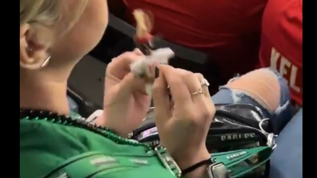 Μία γυναίκα φίλαθλος ντυμένη στα πράσινα, την στολή των Philadelphia Eagles, κάνει «βουντού» σε ένα κουκλάκι με την κόκκινη στολή των Kansas City Chiefs