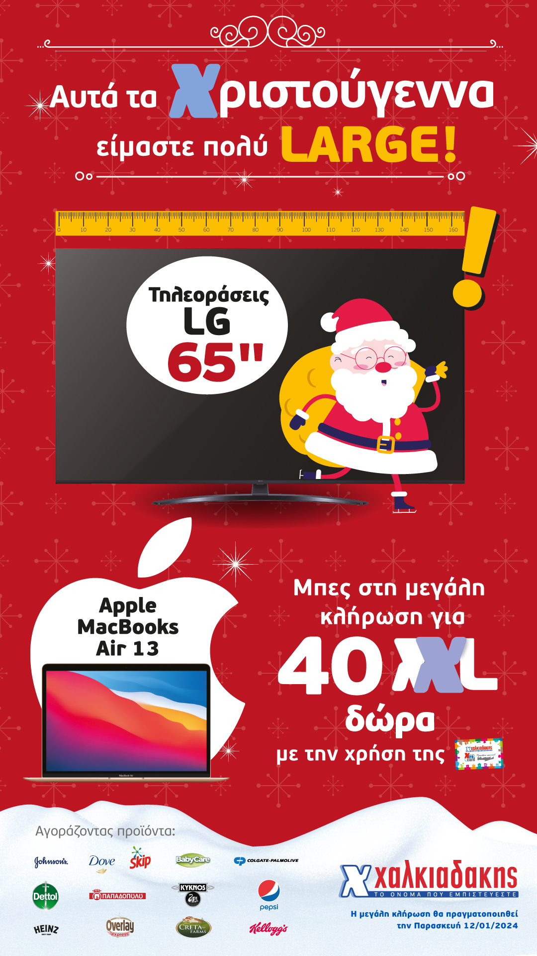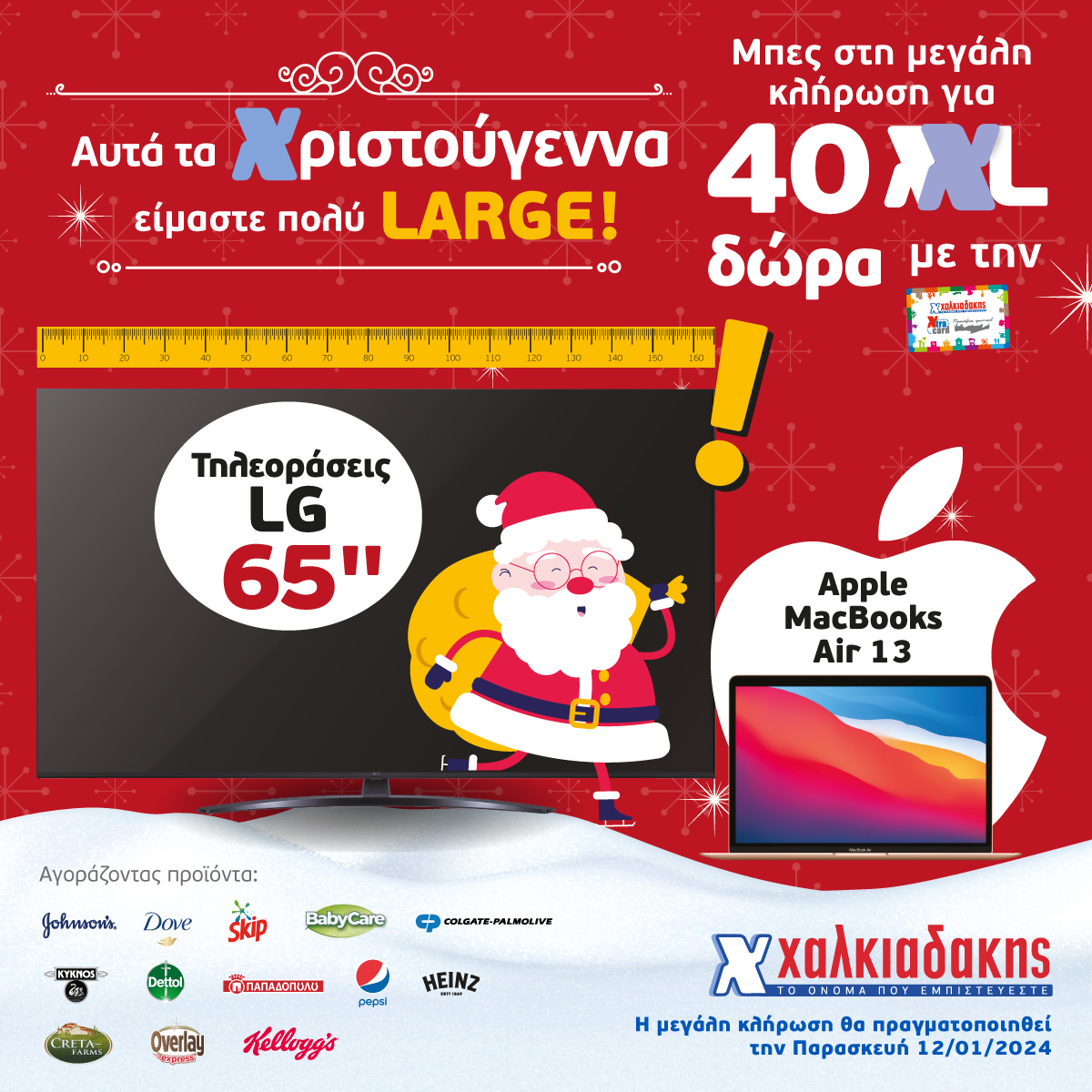Προετοιμαζόμαστε για τα Χριστούγεννα με XXL δώρα που εντυπωσιάζουν από τη μεγαλύτερη οικογένεια της Κρήτης, τα Super Markets Χαλκιαδάκης. 30 συνολικά τηλεοράσεις LG 65’’, για μια εντυπωσιακή εμπειρία τηλεθέασης για όλη την οικογένεια, και 10 Apple Mac Book Air 13, τα laptops της Apple που ξεχωρίζουν για τον εκπληκτικό συνδυασμό λεπτού σχεδιασμού, αξιοπιστίας και απόδοσης μας περιμένουν για να τα κερδίσουμε. Ως και 9/1/24 με κάθε αγορά αγαπημένων μας προϊόντων με την Xtra Card Χαλκιαδάκης, κερδίζουμε μια συμμετοχή στη μεγάλη κλήρωσή των Super Markets Χαλκιαδάκης.