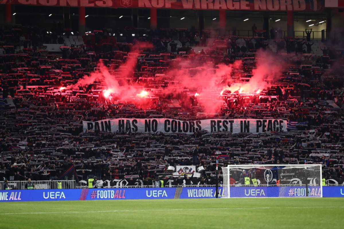 Παράλληλα, λίγο αργότερα, ενώ τηρήθηκε ευλαβικά ενός λεπτού σιγή, οι οπαδοί των «λιονέ», τίμησαν τα θύματα της τραγωδίας και από την εξέδρα. Και στα δύο πέταλα του «Groupama Stadium» αναρτήθηκαν πανό με ξεχωριστά μηνύματα, ενώ όλοι ανεξαιρέτως σήκωσαν τα πανό τους προς τον ουρανό. Στο ένα πανό αναγράφεται στα αγγλικά το μήνυμα «ο πόνος δεν έχει χρώματα, αναπαυτείτε εν ειρήνη» και στο άλλο το «αναπαυτείτε εν ειρήνη» στα ελληνικά.