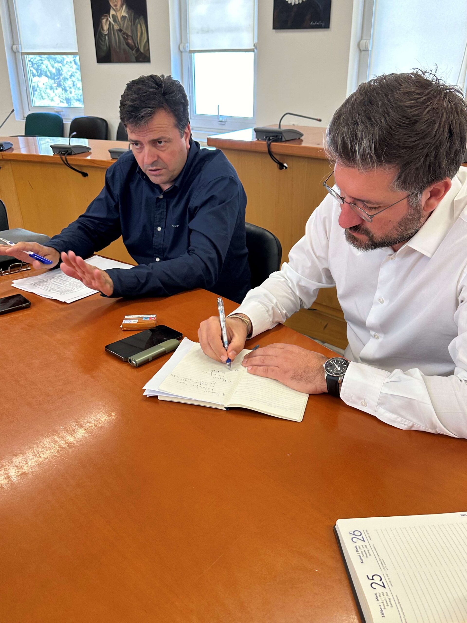 Δήμαρχος και Αντιπεριφερειάρχης Ηρακλείου έκαναν έναν προγραμματισμό των παρεμβάσεων που σχεδιάζει η Διεύθυνση Τεχνικών Έργων της Περιφέρειας σε θέματα οδικής ασφάλειας και έργων οδοποιίας ενώ παράλληλα συζήτησαν και έργα που οι μελέτες τους βρίσκονται στο τελικό τους στάδιο όπως η ανακατασκευή του δρόμου που οδηγεί από το Γάζι στα Καλέσα.