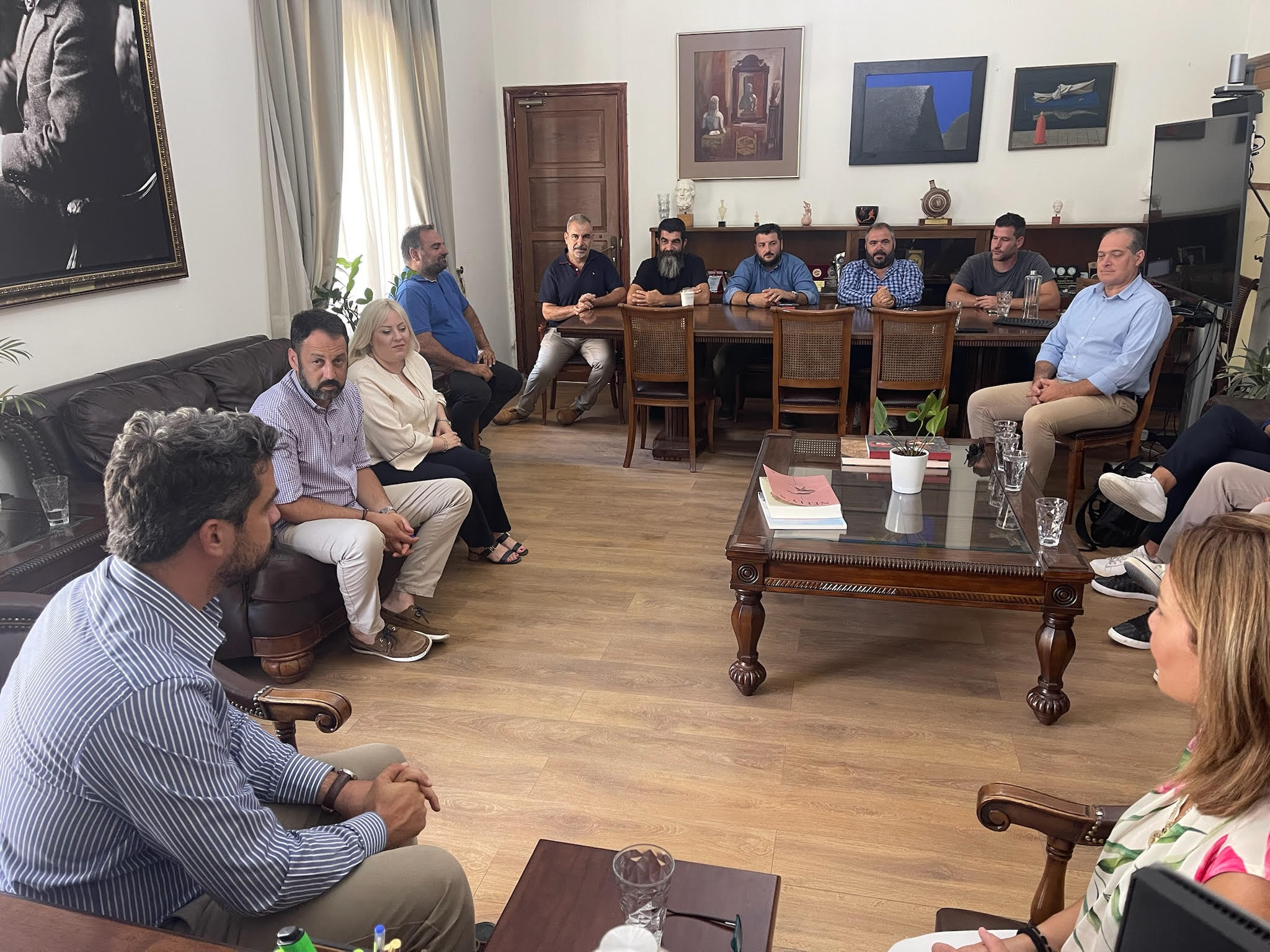 Στη συνάντηση, που πραγματοποιήθηκε στο Γραφείο του Δημάρχου Χανίων, παρουσία του Προέδρου του Δ.Σ. Χανίων, Μανώλη Καραγιαννάκη, και Αντιδημάρχων, παρευρέθηκαν τα μέλη του νέου Δ.Σ. του Εμπορικού Συλλόγου, έπειτα από τις αρχαιρεσίες και τη συγκρότηση σε σώμα, που έγινε πρόσφατα.