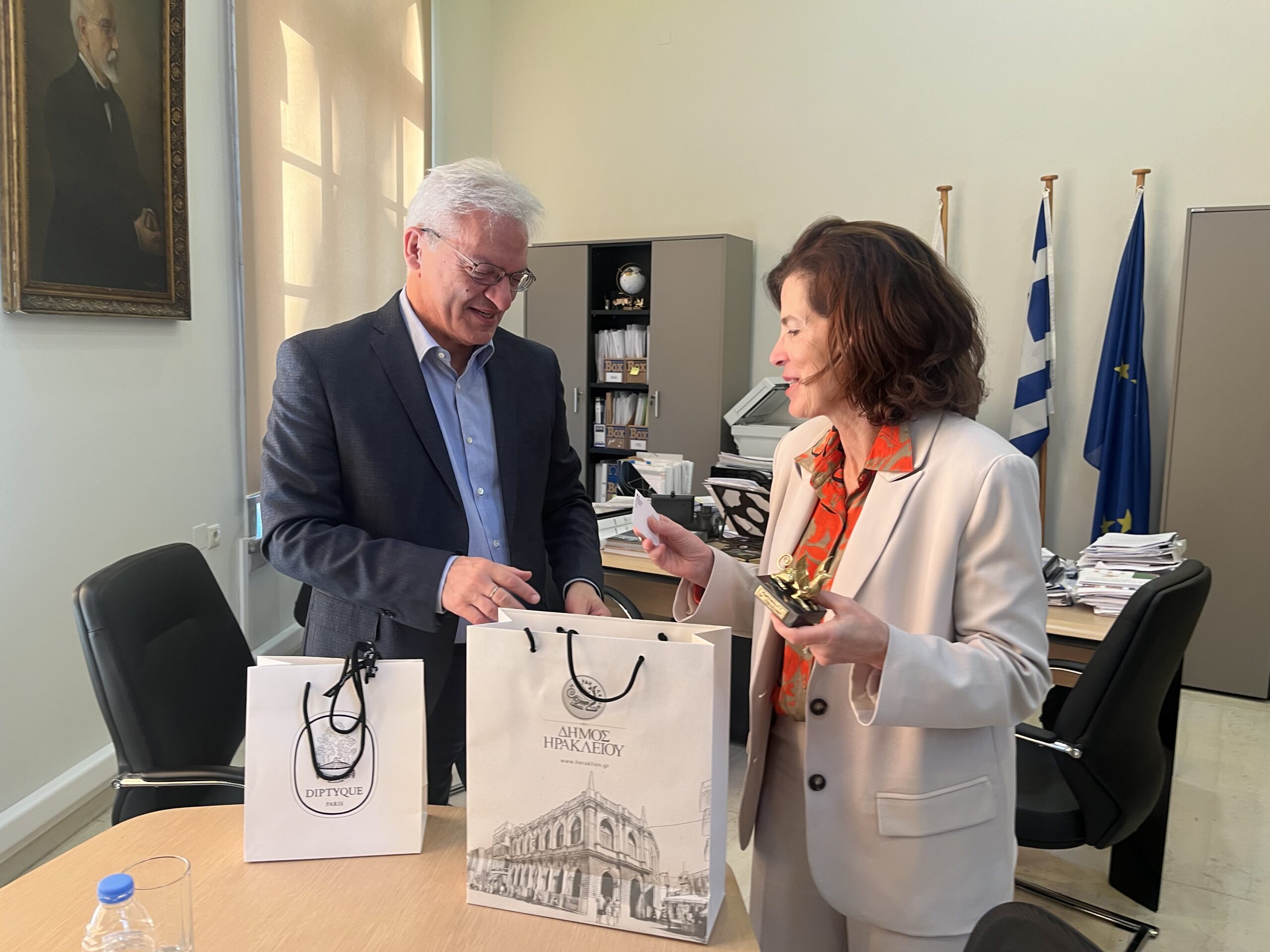 Με την ολοκλήρωση της συνάντησης, ο Δήμαρχος Ηρακλείου δώρισε στην Πρέσβειρα της Γαλλίας το αγαλματίδιο του Γρύπα και τον τόμο «Knosos, The Threshold of European Civilization» του Γιάννη και της Έφης Σακελλαράκη.