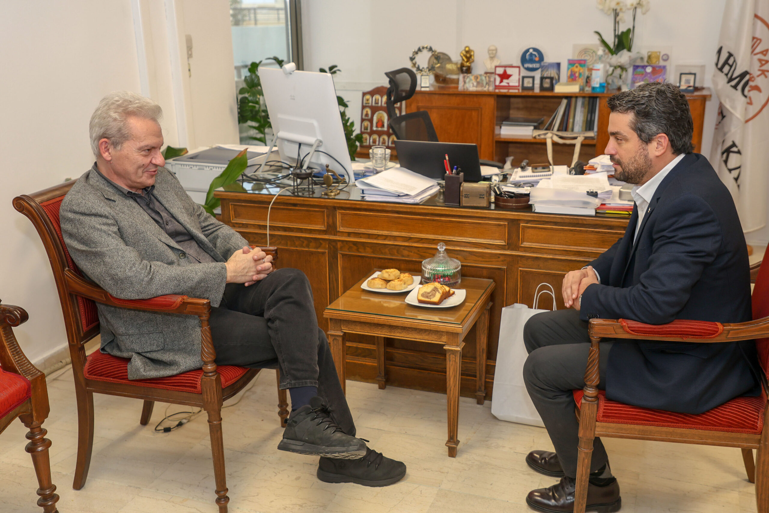 Τον Δήμαρχο Χανίων Παναγιώτη Σημανδηράκη υποδέχθηκε στο γραφείο του ο Δήμαρχος Ηρακλείου Αλέξης Καλοκαιρινός, το μεσημέρι της Τρίτης 16/1/2024.