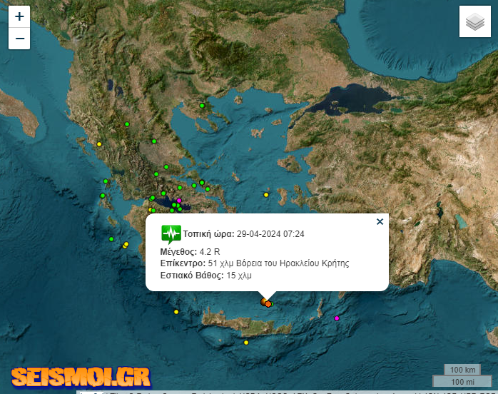 Μετά τον σεισμό των 4 ρίχτερ, λίγα λεπτά μετά τις 5:00 το πρωί της Μεγάλης Δευτέρας, στις 07:24 σημειώθηκε νέος σεισμός 4.2 ρίχτερ 51 χιλιόμετρα Βόρεια του Ηρακλείου.