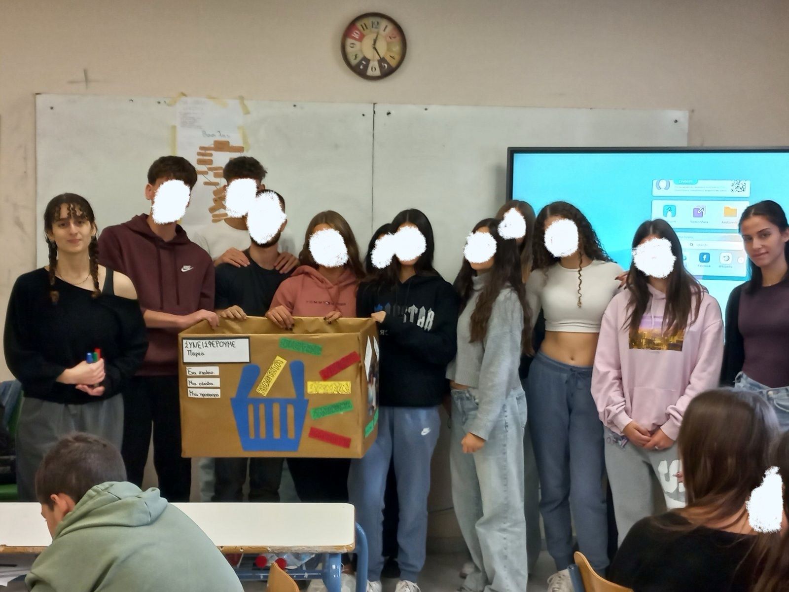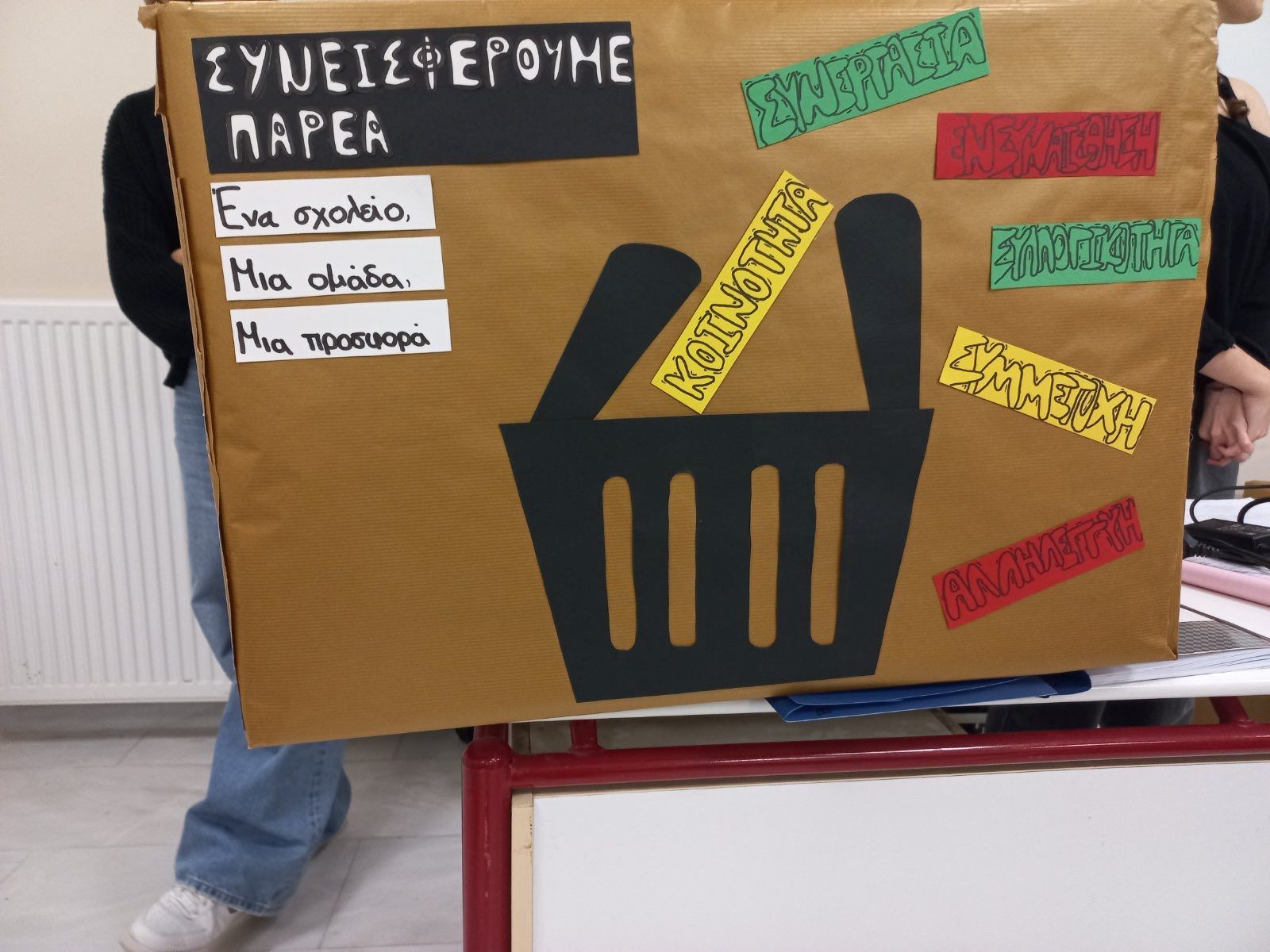 α) τη δημιουργία του χάρτινου κουτιού, το οποίο μέσα από εικόνες, μηνύματα και σύμβολα αποτυπώνει τον σκοπό της δράσης, όπου οι μαθητές θα συλλέγουν τρόφιμα, είδη ατομικής υγιεινής και καθαριστικά για τις ανάγκες των ωφελουμένων του Κοινωνικού Παντοπωλείου Μαλεβιζίου