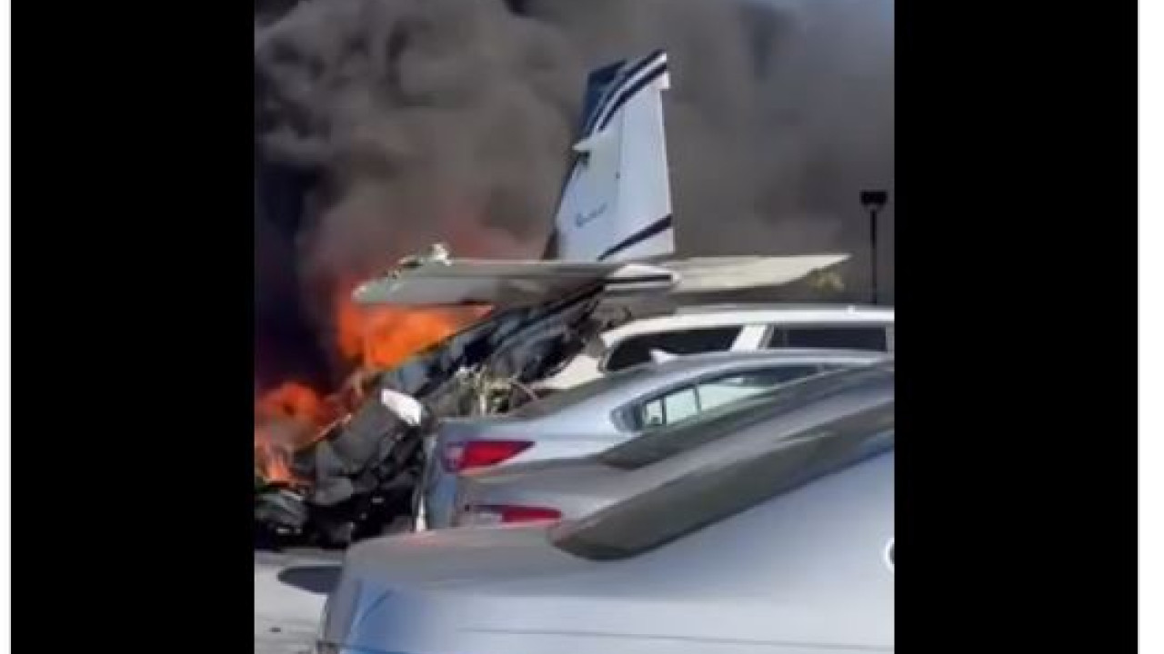 Βίντεο δείχνουν μαύρο καπνό να αναδύεται από τα συντρίμμια και αρκετά σταθμευμένα οχήματα να τυλίγονται στις φλόγες στο σημείο της συντριβής