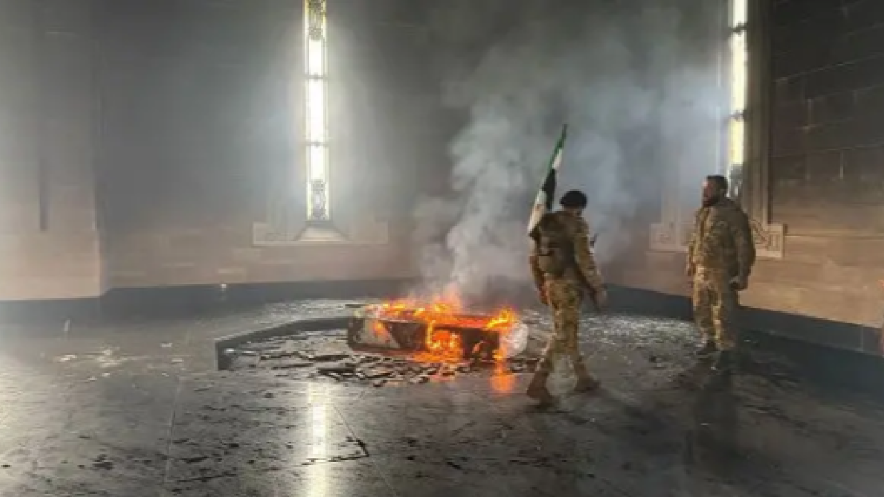 Images emerge from Latakia, Syria, showing rebel fighters beside the burning tomb of Hafez al-Assad, father of ousted president Bashar al-Assad.