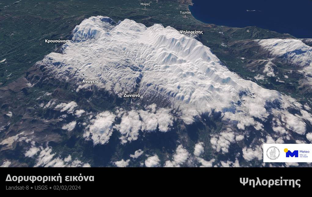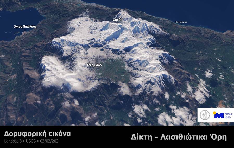Δορυφορικά δεδομένα πολύ υψηλής ανάλυσης του αμερικανικού δορυφόρου Landsat-8, που πέρασε πάνω από τη χώρα μας το πρωί της Παρασκευής 2 Φεβρουαρίου 2024, τα οποία ανέλυσε και επεξεργάστηκε το meteo.gr/Ε.Α.Α σε τρισδιάστατη μορφή (3D), παρουσιάζουν την εκτεταμένη χιονοκάλυψη στα βουνά της Κρήτης, στον Ψηλορείτη και στο όρος Δίκτη (ή Λασιθιώτικα Όρη).