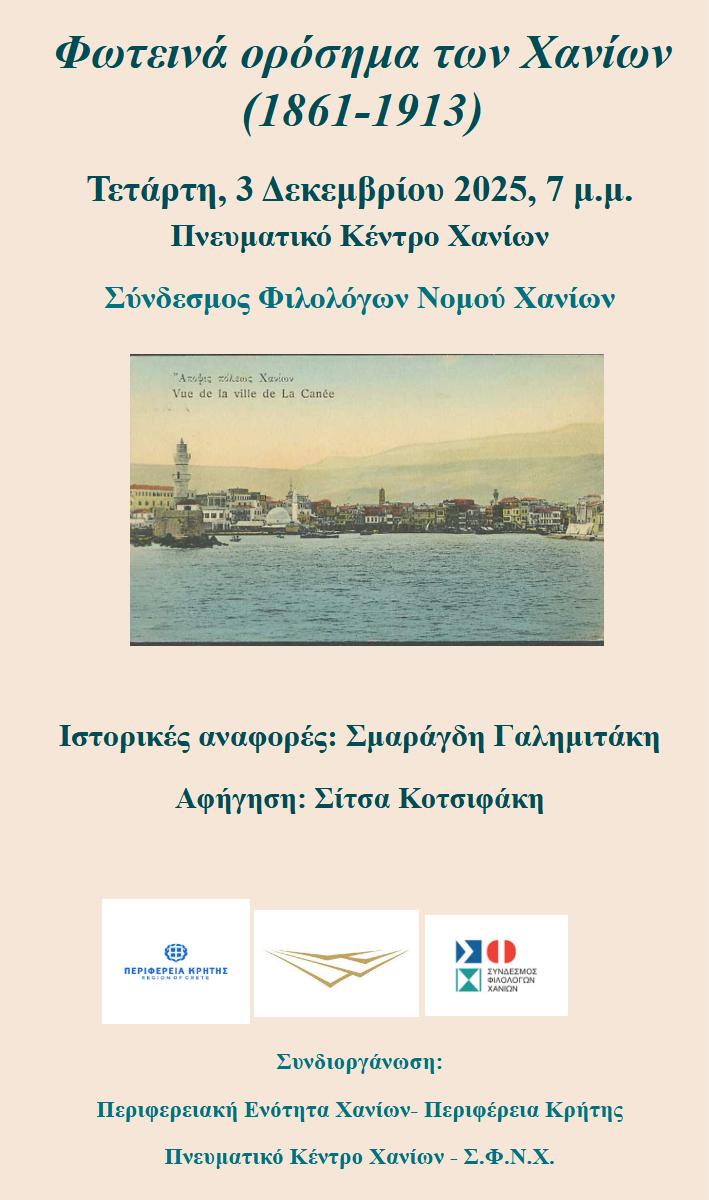 Ο Σύνδεσμος Φιλολόγων Νομού Χανίων (Σ.Φ.Ν.Χ.) σε συνδιοργάνωση με την Περιφέρεια Κρήτης-Περιφερειακή Ενότητα Χανίων και το Πνευματικό Κέντρο Χανίων πραγματοποιεί εκδήλωση την Τετάρτη, 3 Δεκεμβρίου 2025, ώρα 7 μ.μ. στο Πνευματικό Κέντρο με θέμα “Φωτεινά ορόσημα των Χανίων (1861-1913)”.