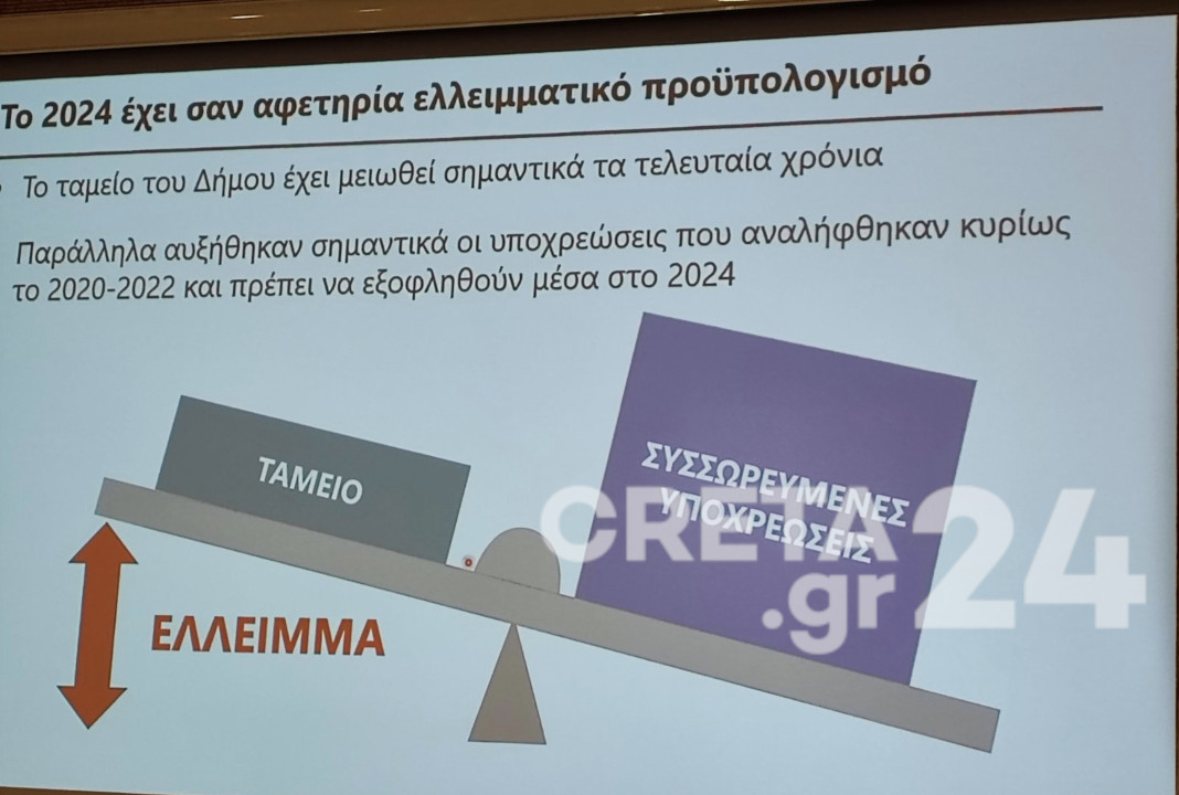 Με στόχο την αναλυτική ενημέρωση των Δημοτών και με γνώμονα τη διαφάνεια σε κάθε πτυχή και διαδικασία, όπως είχε δεσμευτεί προεκλογικά, ο Δήμαρχος Αλέξης Καλοκαιρινός παρουσίασε τα αρνητικά οικονομικά δεδομένα του Δήμου, τα οποία δεν επιτρέπουν τον ισοσκελισμό του προϋπολογισμού του 2024, μαζί με τις προτάσεις της Δημοτικής Αρχής για τη χρηματοοικονομική αναδιάρθρωση του Δήμου Ηρακλείου.