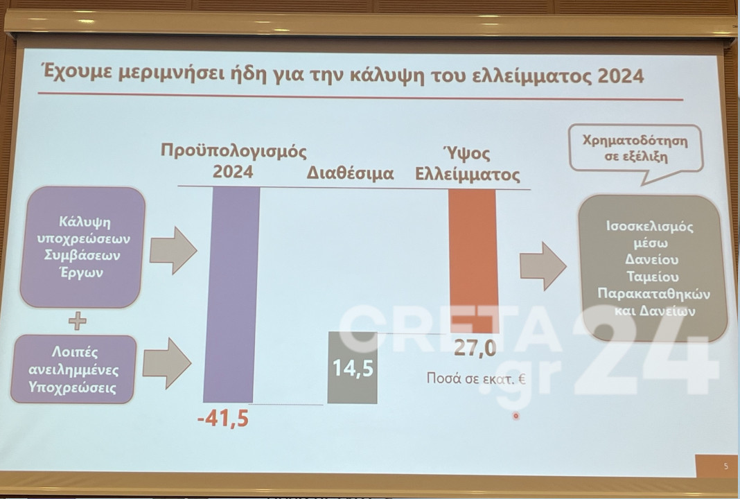 Κατά τη διάρκεια συνέντευξης Τύπου και μέσα από μια τεκμηριωμένη παρουσίαση με τεχνοκρατικά στοιχεία, ο Δήμαρχος Ηρακλείου εστίασε στην πορεία των οικονομικών διαθεσίμων του Δήμου και τις αντίστοιχα ανειλημμένες υποχρεώσεις έως 31-12-2023, καταλήγοντας στη σημερινή οικονομική πραγματικότητα, που οδηγεί σε έλλειμμα ύψους 27.000.000€. Για την κάλυψη του ελλείμματος και την ισοσκέλιση του προϋπολογισμού του Δήμου για το 2024, η Δημοτική Αρχή Ηρακλείου εργάζεται για την εξασφάλιση δυνατότητας δανειακής χρηματοδότησης, μέχρι το ποσό αυτό.