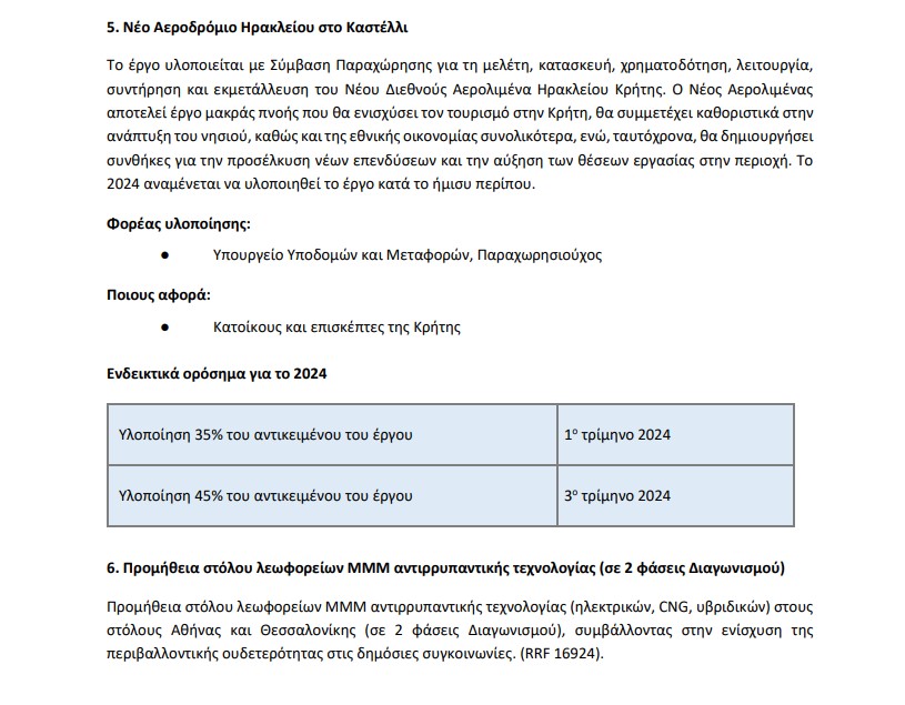 Ειδικό κεφάλαιο για τα επόμενα στάδια στην υλοποίηση των μεγάλων κατασκευαστικών project του ΒΟΑΚ και του αεροδρομίου στο Καστέλι, περιλαμβάνει το Ενοποιημένο Σχέδιο Κυβερνητικής Πολιτικής για το 2024.