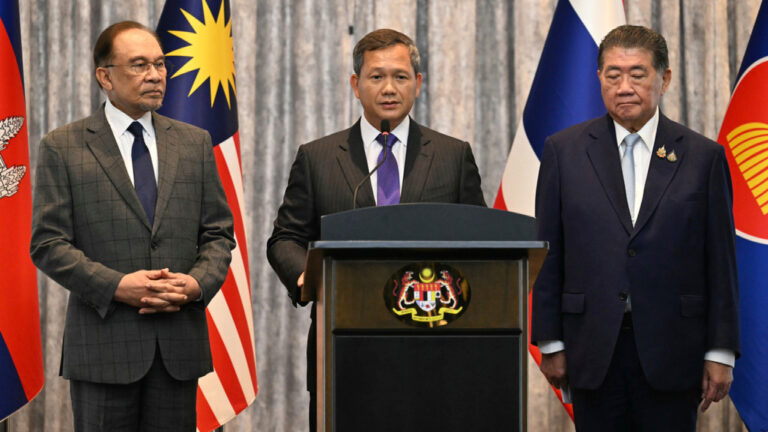 Η Ταϊλάνδη θεωρεί ότι επαφίεται στην Καμπότζη να ανακοινώσει «πρώτη» την κατάπαυση του πυρός στα σύνορα των δύο χωρών, μετά τις συγκρούσεις που στοίχισαν τη ζωή σε τουλάχιστον 34 ανθρώπους και ανάγκασαν άλλους 800.000 να εγκαταλείψουν την περιοχή.