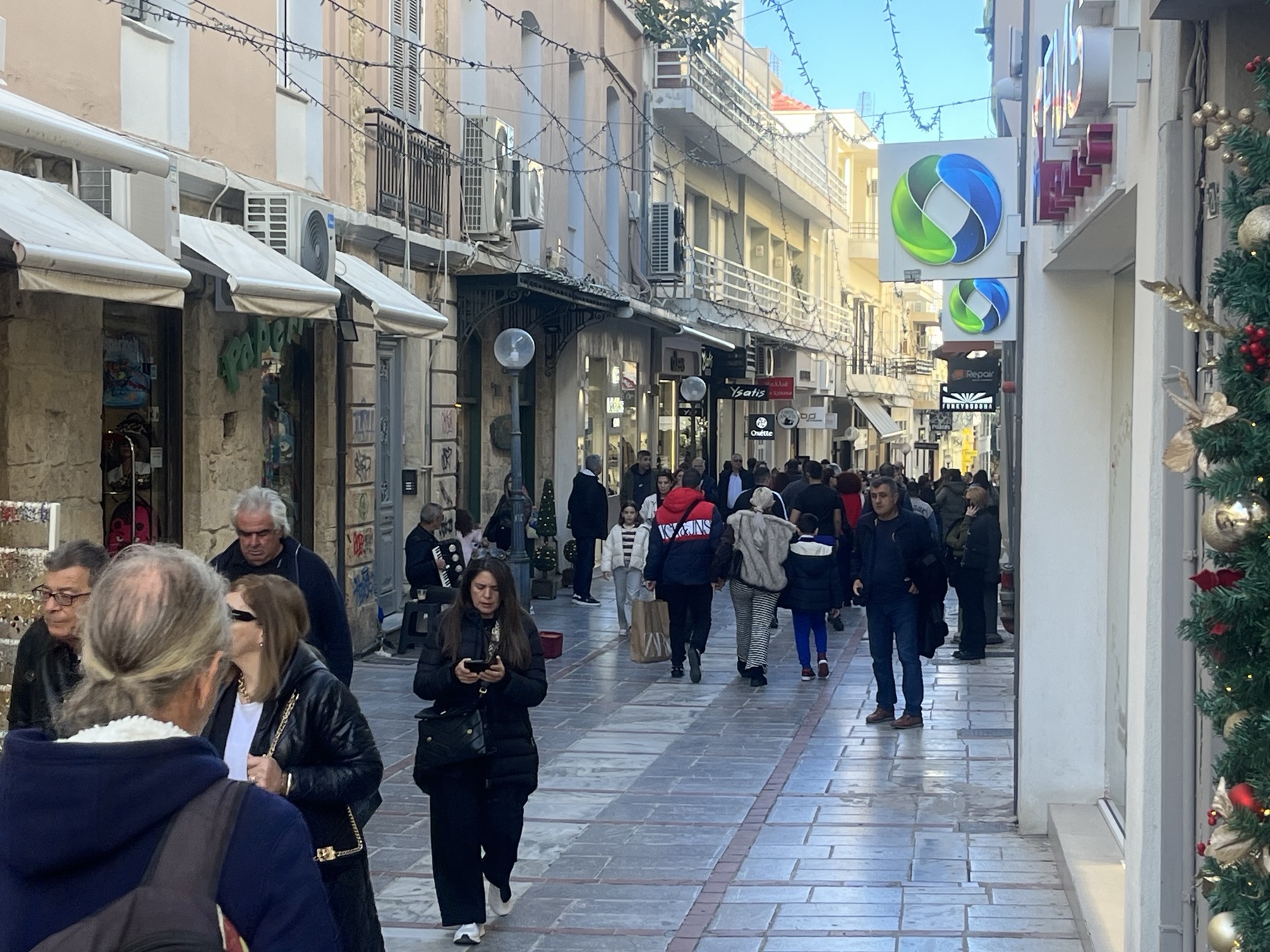 Μόλις «σήκωσαν ρολά» τα καταστήματα, το κέντρο του Ηρακλείου ξεκίνησε να γεμίζει από κόσμο για τα ψώνια ενόψει Πρωτοχρονιάς, σήμερα, τελευταία Κυριακή του έτους.