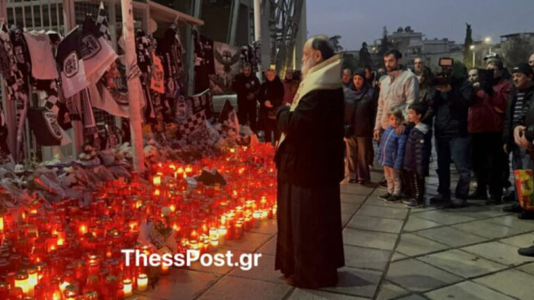 Πριν από λίγο, ο Αρχιεπίσκοπος Λύδδης Δημήτριος βρέθηκε στο άτυπο μνημείο για τους νεαρούς φίλαθλους και τέλεσε επιμνημόσυνη δέηση.