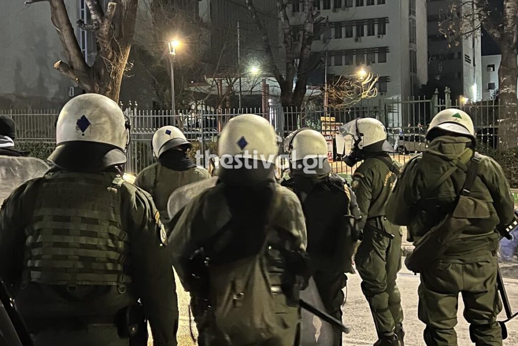 Λίγο μετά τις 10 το βράδυ, περίπου 40 άτομα με κουκούλες βγήκαν από το campus του Αριστοτελείου Πανεπιστημίου και επιτέθηκαν στις αστυνομικές δυνάμεις