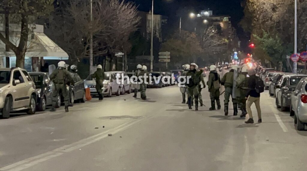 Λίγο μετά τις 10 το βράδυ, περίπου 40 άτομα με κουκούλες βγήκαν από το campus του Αριστοτελείου Πανεπιστημίου στην οδό Εθνικής Αμύνης, πέταξαν πέτρες και εκτόξευσαν πυροτεχνήματα προς αστυνομικές δυνάμεις, που βρίσκονταν κοντά στο σημείο.