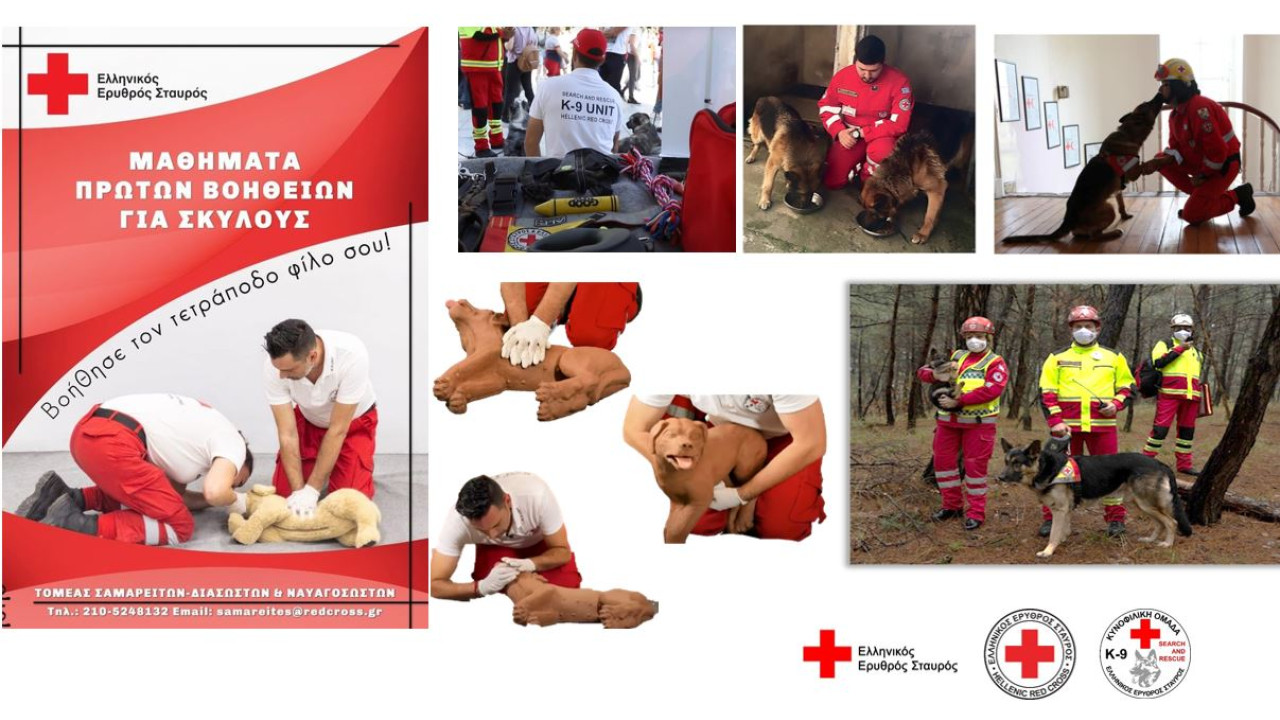 Ο Ελληνικός Ερυθρός Σταυρός, υπό την προεδρία του Δρ. Αντωνίου Ανγερινού, πρωτοπόρου στην εκμάθηση Πρώτων Βοηθειών στην Ελλάδα, διοργανώνει τα εκπαιδευτικά σεμινάρια Πρώτων Βοηθειών για σκύλους από την Κυνοφιλική Ομάδα Έρευνας και Διάσωσης (Κ9) που διαθέτει. Το καινοτόμο για τα ελληνικά δεδομένα πρόγραμμα είναι διάρκειας τεσσάρων ωρών και στόχος του είναι ο φροντιστής κατοικίδιων να μπορεί να δράσει έγκαιρα και αποτελεσματικά σε μία έκτακτη κατάσταση που πιθανόν να προκύψει.