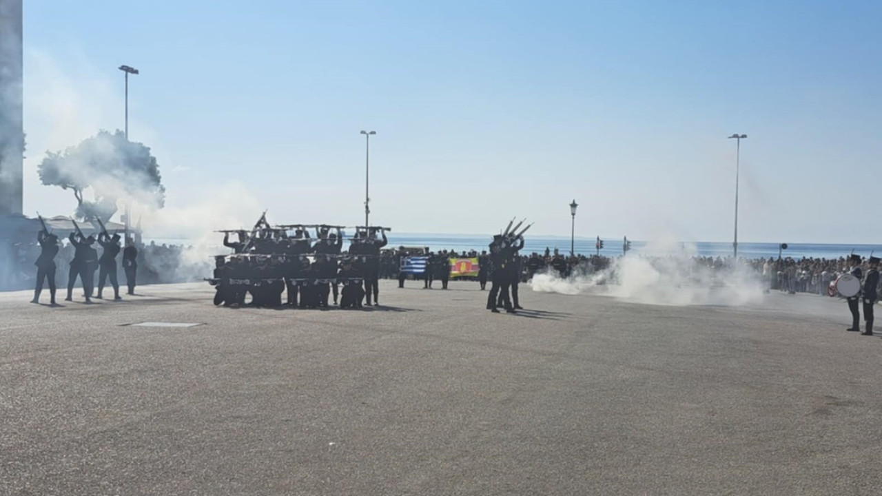 Όπως συμβαίνει τα τελευταία χρόνια ανήμερα της 26ης Οκτωβρίου, η Διμοιρία Επιδείξεων της Στρατιωτικής Σχολής Αξιωματικών Σωμάτων (ΣΣΑΣ) και οι Μουσικοί των τριών κλάδων των Ενόπλων Δυνάμεων, πραγματοποίησαν εντυπωσιακή επίδειξη, με φόντο την παλιά παραλία της πόλης.