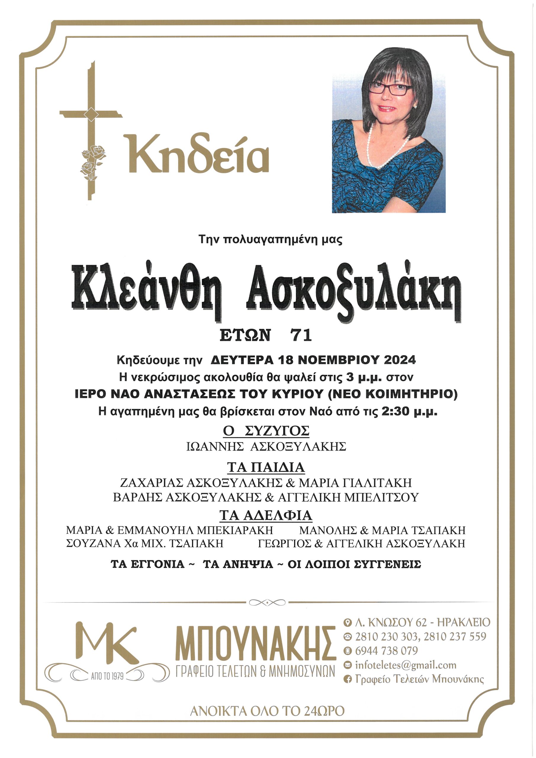 Το άρθρο “Θλίψη για τον θάνατο της Κλεάνθης Ασκοξυλάκη“, δημοσιεύθηκε για πρώτη φορά στο CRETA24.