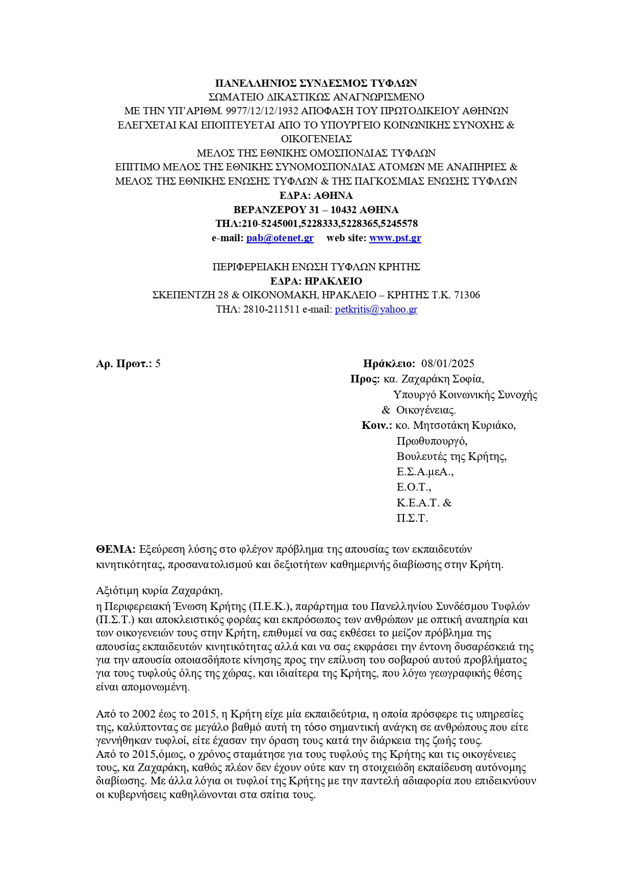 Με την επιστολή τους τα μέλη της Ένωσης, εκφράζουν την έντονη ανησυχία τους για το μείζον πρόβλημα της απουσίας εκπαιδευτών κινητικότητας, αλλά και για την απουσία οποιασδήποτε κίνησης προς την επίλυσή του, επισημαίνοντας ότι αφορά τους τυφλούς όλης της χώρας και ιδιαίτερα της Κρήτης, που λόγω γεωγραφικής θέσης είναι απομονωμένη.