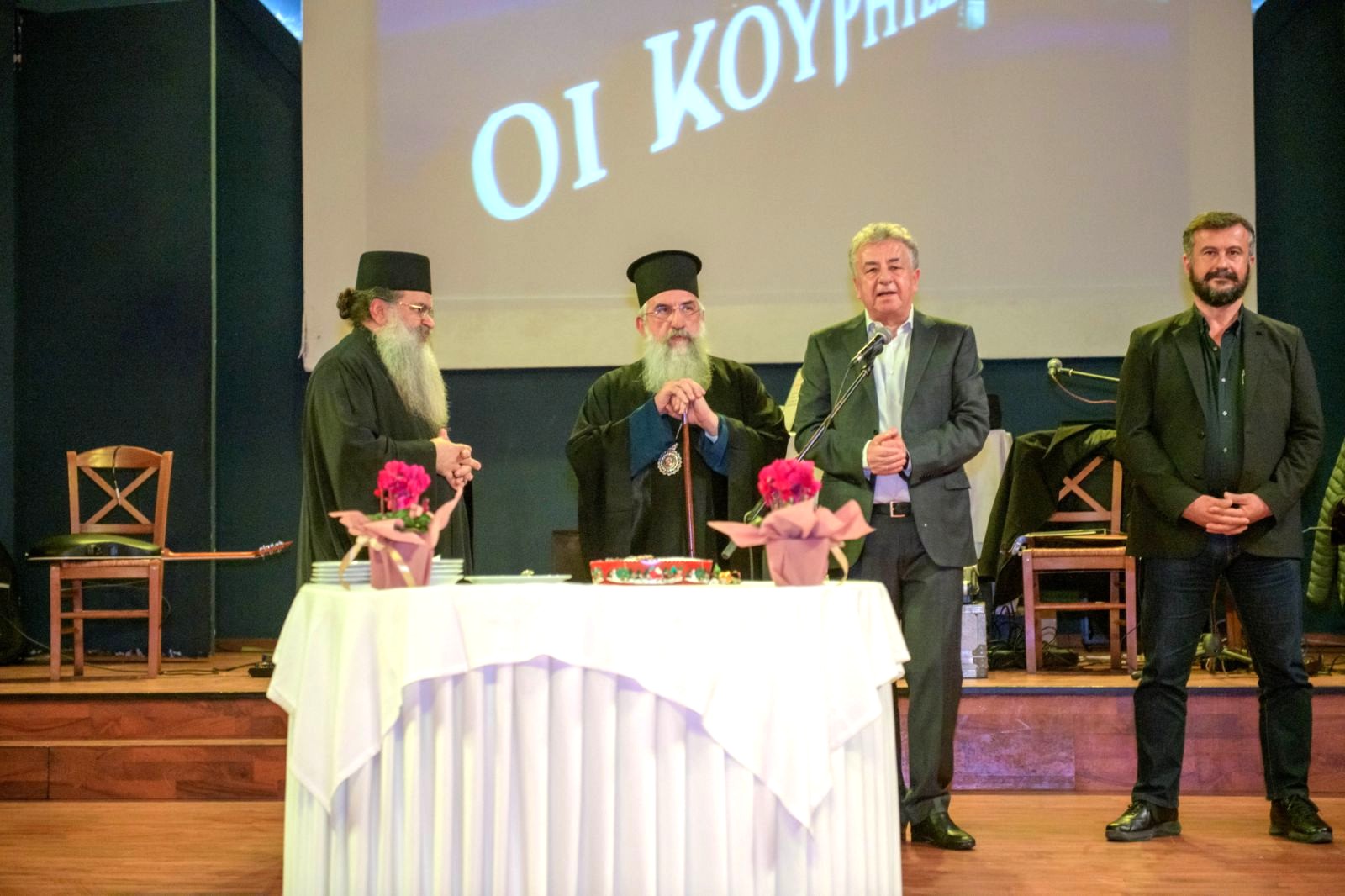 Η ανακοίνωση της υλοποίησης του έργου από τον Περιφερειάρχη παράλληλα με τις ευχές του για το νέο έτος έγινε δεκτή με θερμά χειροκροτήματα των φίλων της Μονής στην κατάμεστη από κόσμο αίθουσα μεγάλου κέντρου κοινωνικών εκδηλώσεων της περιοχής Γαζίου. Προηγήθηκαν οι προσφωνήσεις των οργανωτών αλλά και η ευλόγηση της πρωτοχρονιάτικης πίτας από τον Αρχιεπίσκοπο Κρήτης κκ Ευγένιο. Μάλιστα κατά την κοπή της πίτας από τον Περιφερειάρχη και τον ηγούμενο, ο Αρχιεπίσκοπος παράλληλα με τις ευχές του για το νέο έτος, ευχήθηκε να αυξάνουν συνεχώς τα ταμεία της Περιφέρειας, ώστε να είναι μεγαλύτερα και περισσότερα τα μερίδια που θα λαμβάνουν σε έργα οι φορείς, αλλά και η Εκκλησία. Επίσης στον λόγο του ο Αρχιεπίσκοπος εξήρε το πνευματικό έργο της Μονής, χαρακτηρίζοντάς την ως το «Άγιον Όρος της Κρήτης» λόγω του ασκητικού της χαρακτήρα και της προσφοράς της, στον τόπο, στους πολίτες αλλά και στους προσκυνητές από όλη την Ελλάδα που επισκέπτονται το μοναστήρι.