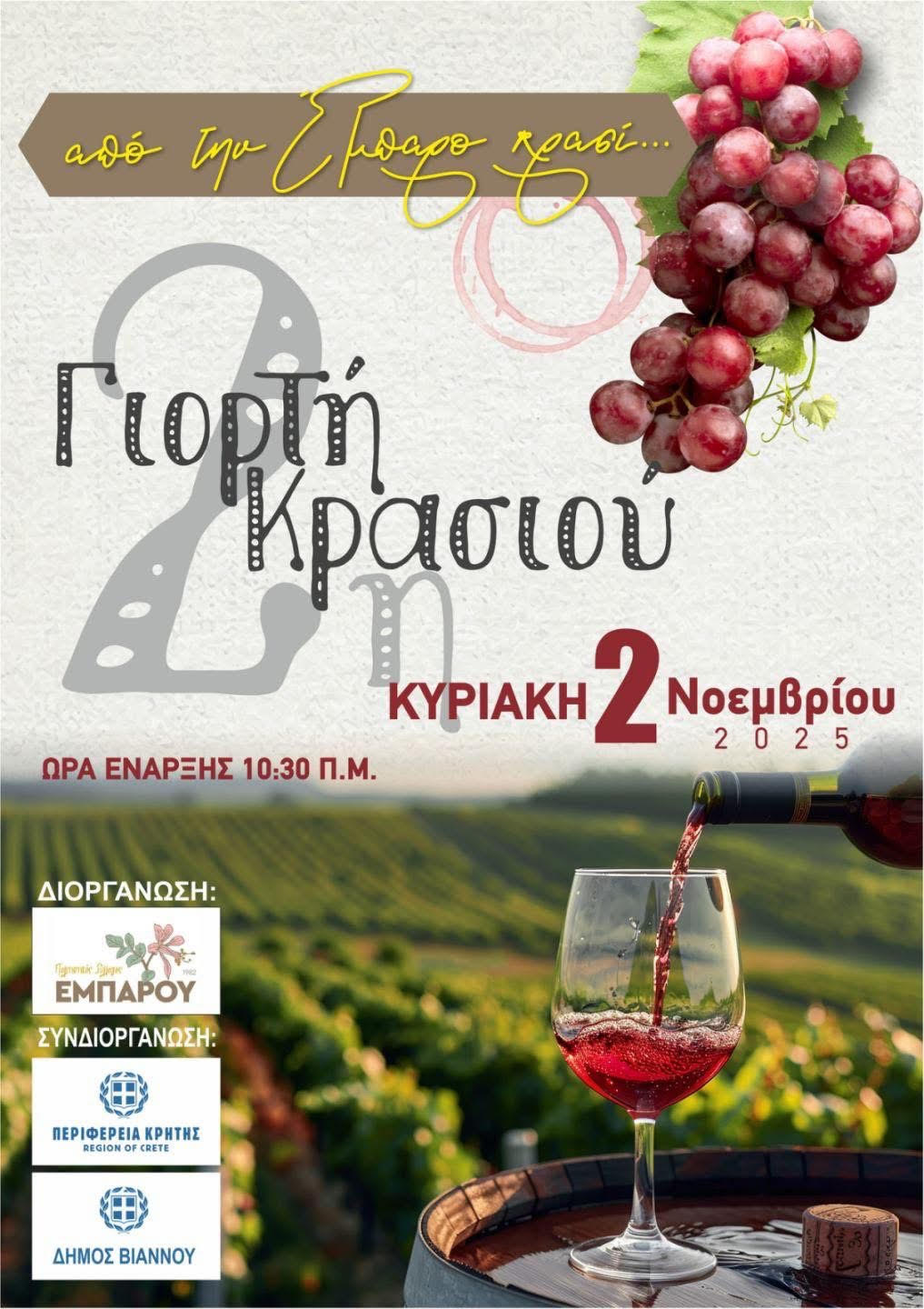Αύριο, Κυριακή 2 Νοεμβρίου, πραγματοποιείται στην Έμπαρο του Δήμου Βιάννου η 2η Γιορτή Κρασιού «Από την Έμπαρο κρασί…», μια εκδήλωση που συνδυάζει την πλούσια οινική παράδοση της περιοχής με τη μουσική, τη γαστρονομία και την τοπική κουλτούρα.