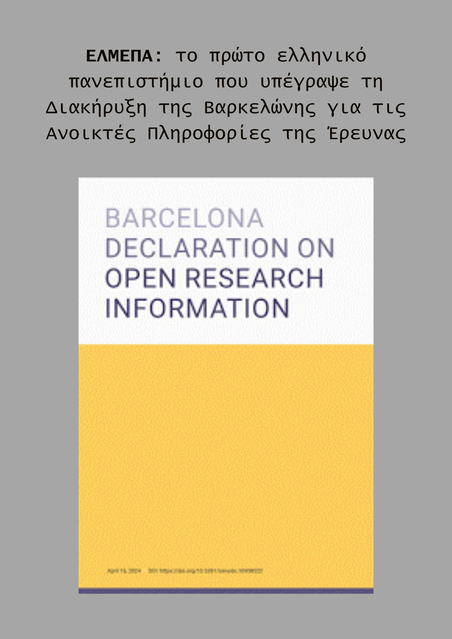 Το Ελληνικό Μεσογειακό Πανεπιστήμιο (ΕΛΜΕΠΑ) υπέγραψε τη Διακήρυξη της Βαρκελώνης για τις Ανοικτές Πληροφορίες της Έρευνας αποτελώντας το πρώτο ελληνικό πανεπιστήμιο που συμμετέχει στην πρωτοβουλία, και στηρίζοντας ενεργά την ευρωπαϊκή προσπάθεια για μεγαλύτερη διαφάνεια στη χρήση ερευνητικών πληροφοριών.