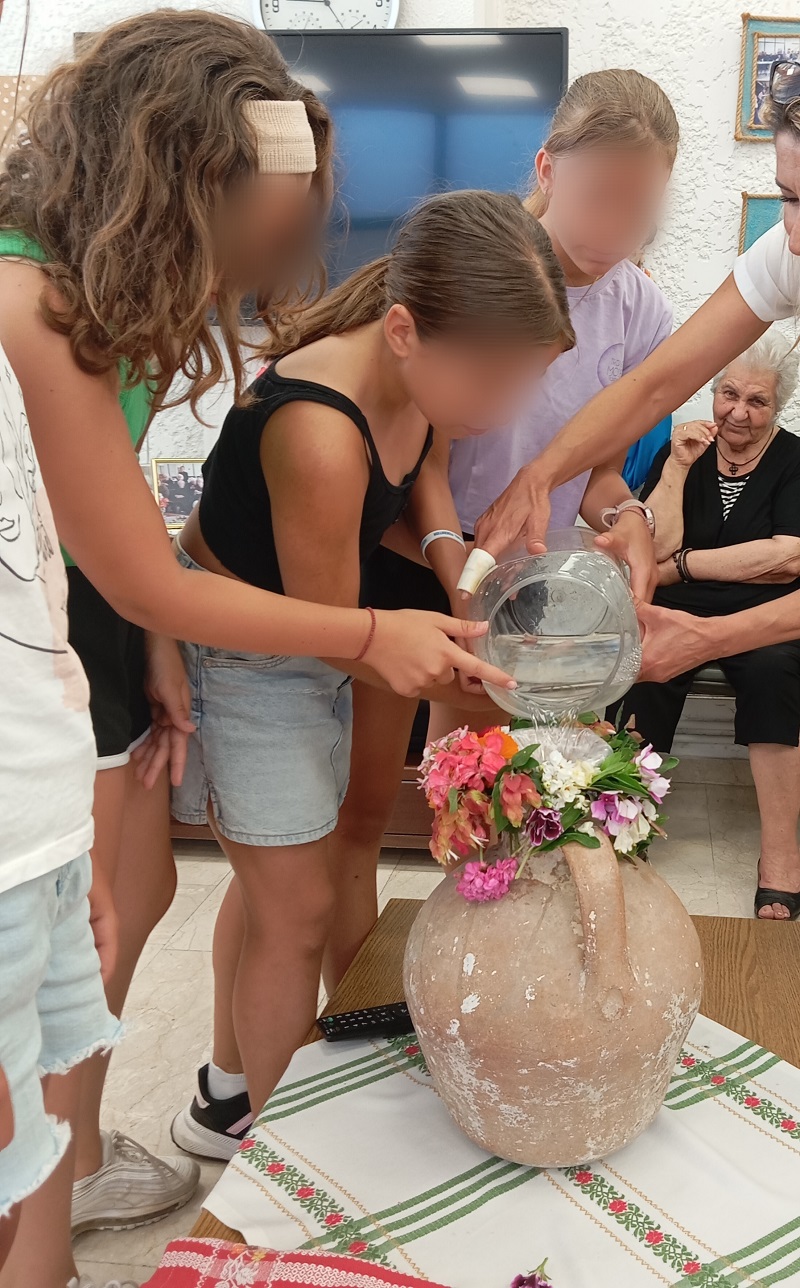 Στην συνέχεια οι ωφελούμενοι του Κ.Η.Φ.Η., ξυπνώντας μνήμες από την εποχή της νιότης τους, μίλησαν στα παιδιά του ΚΔΑΠ γι’ αυτό το πολύ όμορφο έθιμο που έχει τις ρίζες του στην αρχαιότητα και που εκτός από μια αφορμή για ψυχαγωγία και διασκέδαση, όπως είπαν, αποτελούσε μια μαντική διαδικασία κατά την διάρκεια της οποίας οι ανύπαντρες κοπέλες μάθαιναν ποιόν και αν θα παντρευτούν. Ακολούθησε η αναπαράσταση της μεταφοράς του « αμίλητου νερού» από τα μικρά κορίτσια που δέχτηκαν και τα σχετικά «πειράγματα» …όπως ορίζει το έθιμο και το «ρίξιμο» των χαραγμένων φρούτων μέσα στο σταμνί με το αμίλητο νερό. Η αναβίωση του εθίμου ολοκληρώθηκε με το «κλείδωμα» και το «άνοιγμα» του Κλήδονα και την απαγγελία μαντινάδων όπως απαιτεί η διαδικασία. Ξεχωριστή θέση στην διαδικασία αυτή είχαν οι «ζαχαρωτές μαντινάδες» που έφτιαξε το προσωπικό με τα παιδιά του ΚΔΑΠ, ενώ η μουσικός του ΚΔΑΠ κ. Εμμανουέλα Στρατάκη με το αρμόνιό της και τα παιδιά με τα μεταλλόφωνά τους ταξίδεψαν τους συμμετέχοντες με τις όμορφες μελωδίες τους και τα τραγούδια τους σκορπώντας χαρά και χαμόγελα σε όλους.