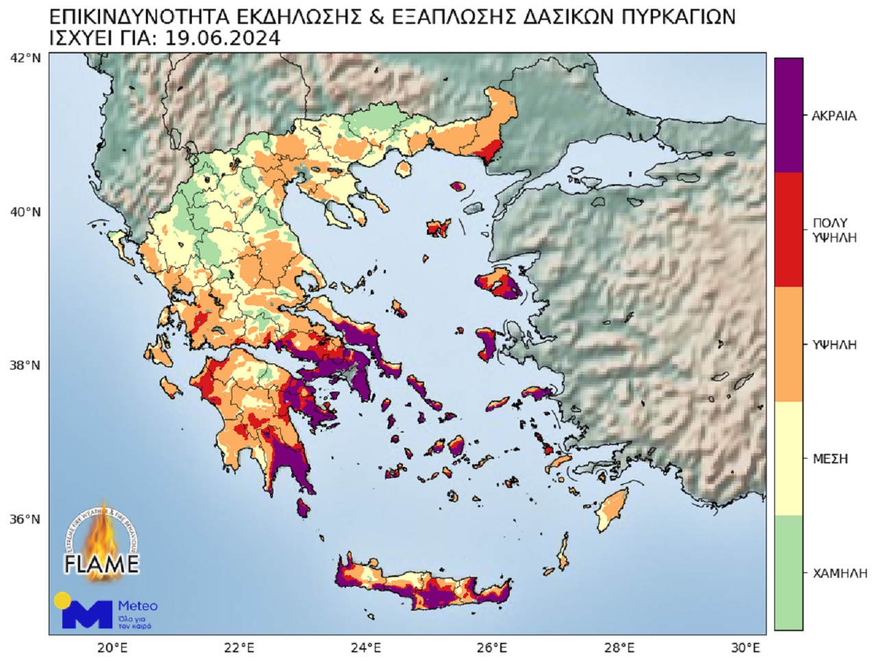 Συνολικά, οι πυρομετεωρολογικές συνθήκες από Τρίτη 18 έως και (τουλάχιστον) την Παρασκευή 21 Ιουνίου 2024 αναμένεται να χαρακτηριστούν από τον ιδιαίτερα επικίνδυνο, για την εκδήλωση και εξάπλωση δασικών πυρκαγιών, τύπο καιρού Hot – Dry – Windy.