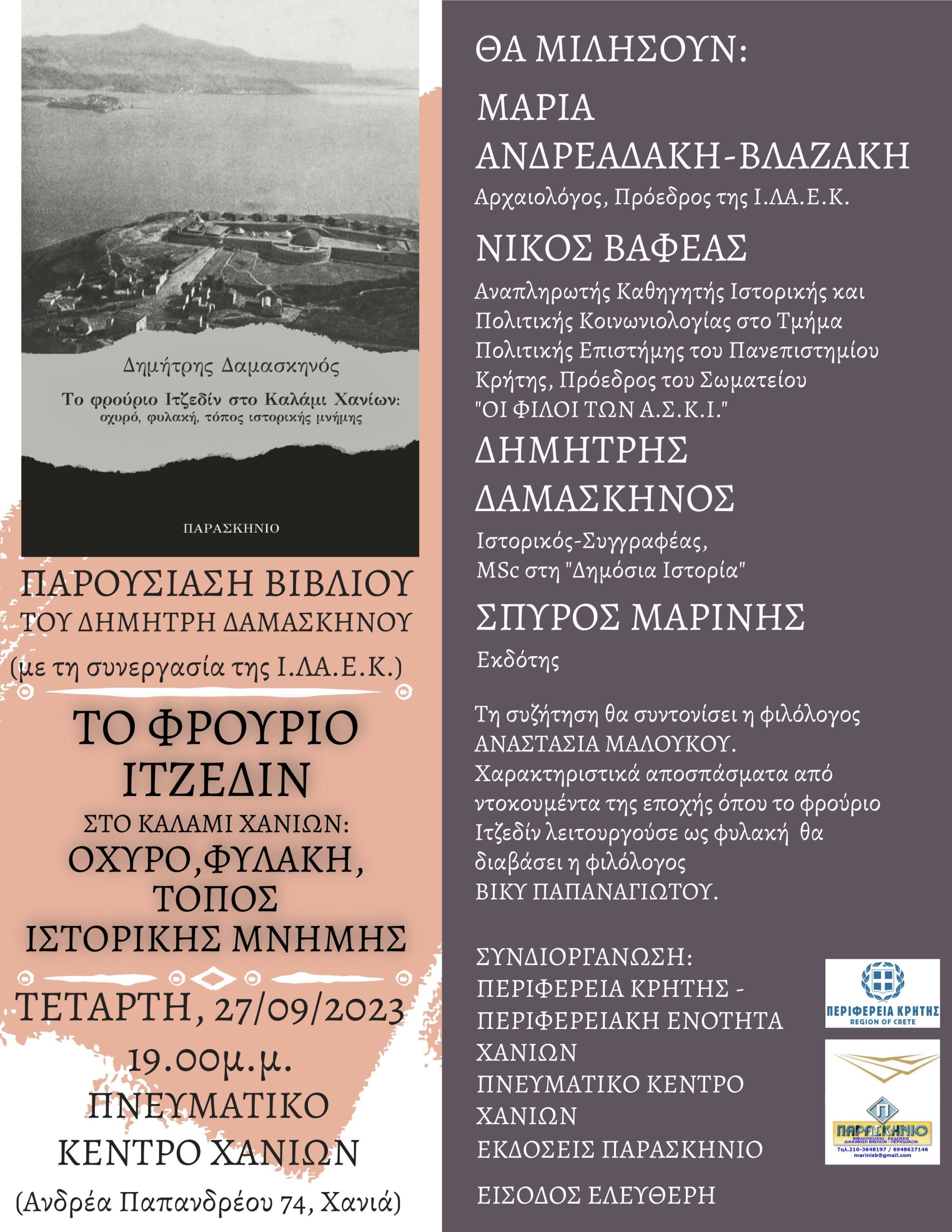 Η Περιφέρεια Κρήτης – Περιφερειακή Ενότητα Χανίων, το Πνευματικό Κέντρο Χανίων, οι εκδόσεις «Παρασκήνιο», με τη συνεργασία της Ι.Λ.Α.Ε.Κ., συνδιοργανώνουν την παρουσίαση του βιβλίου του Δημήτρη Δαμασκηνού «ΤΟ ΦΡΟΥΡΙΟ ΙΤΖΕΔΙΝ ΣΤΟ ΚΑΛΑΜΙ ΧΑΝΙΩΝ»: Οχυρό, φυλακή, τόπος ιστορικής μνήμης, την Τετάρτη 27 Σεπτεμβρίου 2023, ώρα 19.00, στο Πνευματικό Κέντρο Χανίων.