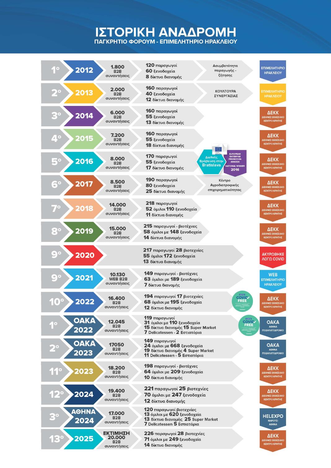 Στο φετινό, 13ο Παγκρήτιο Forum Προώθησης Κρητικών Προϊόντων στα Κρητικά Ξενοδοχεία και τα Δίκτυα Διανομής – Super Market, έχουν δηλώσει συμμετοχή 227 παραγωγοί και μεταποιητές αγροτικών προϊόντων, 28 μεταποιητές από τον βιοτεχνικό τομέα, 71 όμιλοι ξενοδοχείων που εκπροσωπούν 249 ξενοδοχεία, 3 Super Markets, 9 Δίκτυα Διανομής και 2 επιχειρήσεις εστίασης.
