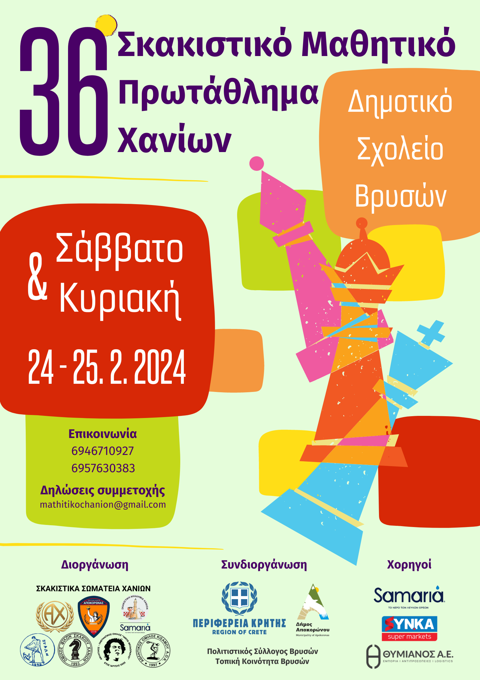 Το Σάββατο 24 και την Κυριακή 25 Φεβρουαρίου 2024, θα διεξαχθεί στις Βρύσες, το 36ο Σκακιστικό Μαθητικό Πρωτάθλημα Χανίων. Διοργανωτές των αγώνων, είναι όλα τα Σκακιστικά Σωματεία του Νομού Χανίων (ο Αθλητικός Όμιλος ΚΥΔΩΝ, ο Αθλητικός Σύλλογος ΑΠΟΚΟΡΩΝΑΣ, ο Όμιλος Αντισφαίρισης Χανίων, η Σκακιστική Ακαδημία Χανίων-ΣΑΜΑΡΙΑ, , ο Όμιλος Φίλων Σκακιού Χανίων, ο Α.Π.Ο. «Μίκης Θεοδωράκης», ο Α.Ο.Κισσάμου), και η Ένωση Σκακιστικών Σωματείων Κρήτης (ΕΣΣΚ), σε συνεργασία με τον Δήμο Αποκορώνου την Περιφερειακή Ενότητα Χανίων, τον Πολιτιστικό Σύλλογο Βρυσών , την Τοπική Κοινότητα Βρυσών.