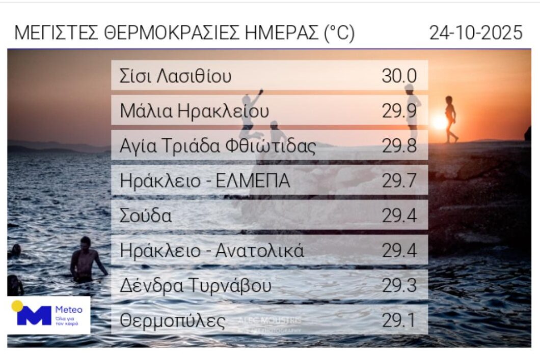Ο Οκτώβριος θυμίζει περισσότερο… Ιούλιο, καθώς στην Κρήτη καταγράφονται απανωτά ρεκόρ υψηλών θερμοκρασιών. Για ακόμη μια ημέρα, σήμερα Παρασκευή 24/10, σύμφωνα με το meteo.gr του Εθνικού Αστεροσκοπείου Αθηνών, ο υδράργυρος έδειξε 30 βαθμούς κελσίου στο Σίσι Λασιθίου και 29.9 βαθμούς στα Μάλια.