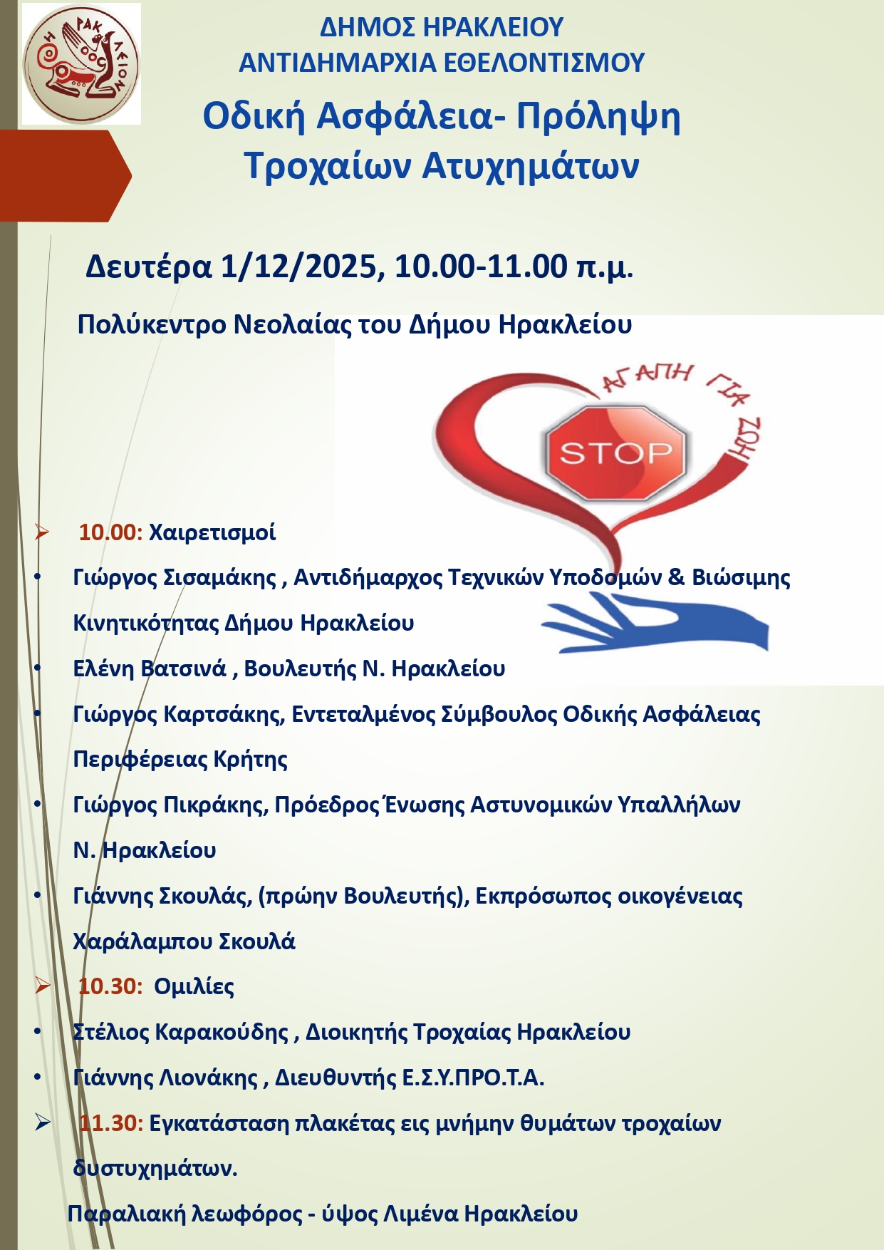 Εκδήλωση με θέμα «Οδική Ασφάλεια – Πρόληψη Τροχαίων Ατυχημάτων» διοργανώνει ο Δήμος Ηρακλείου μέσω της Αντιδημαρχίας Εθελοντισμού τη Δευτέρα 1 Δεκεμβρίου στο Πολύκεντρο του Δήμου Ηρακλείου στο δημοτικό κτίριο της Ανδρόγεω.