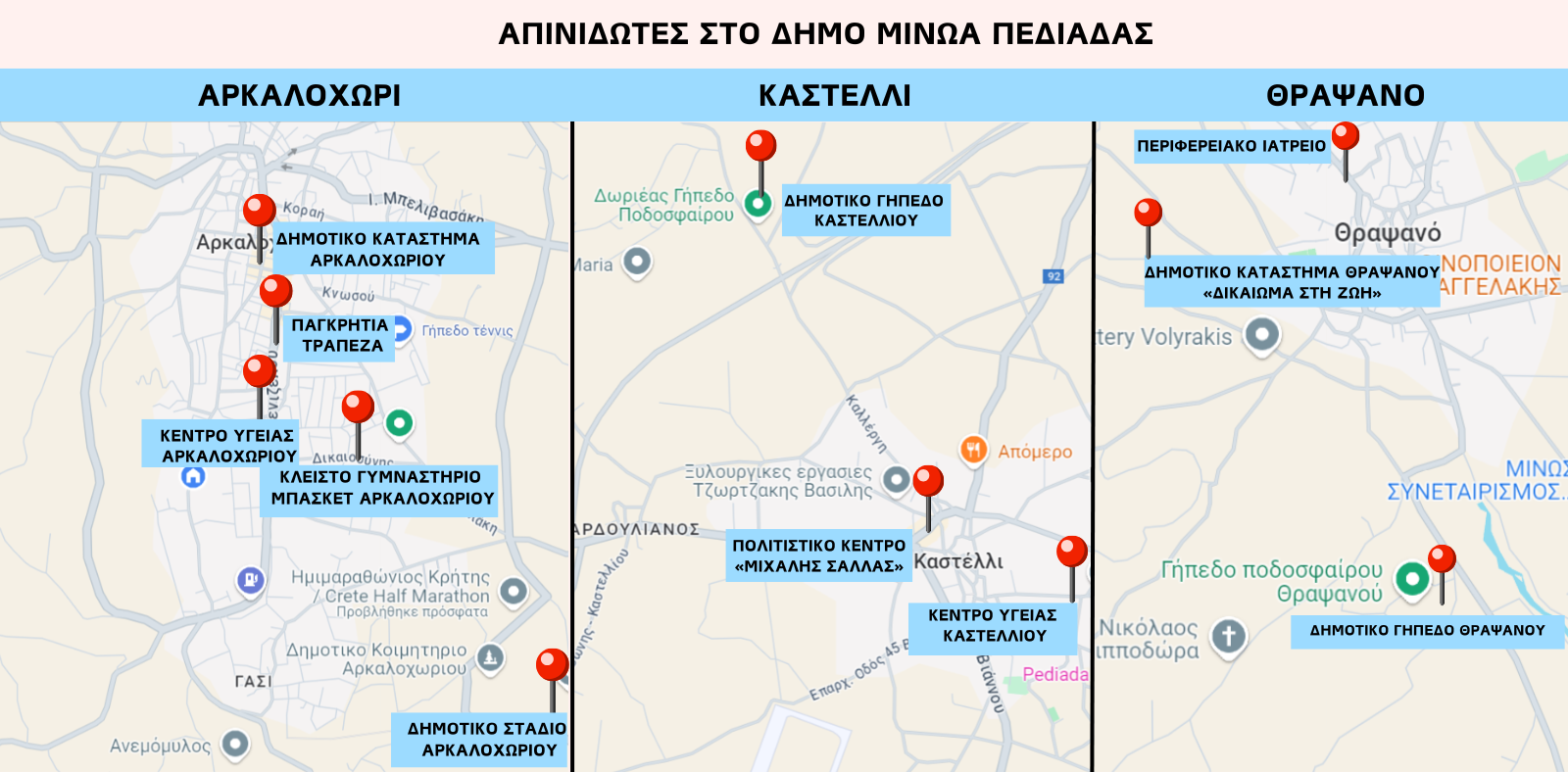 Αυτόματοι Εξωτερικοί Απινιδωτές τοποθετήθηκαν στα εξής σημεία των τριών Δημοτικών Ενοτήτων Αρκαλοχωρίου, Καστελλίου και Θραψανου: