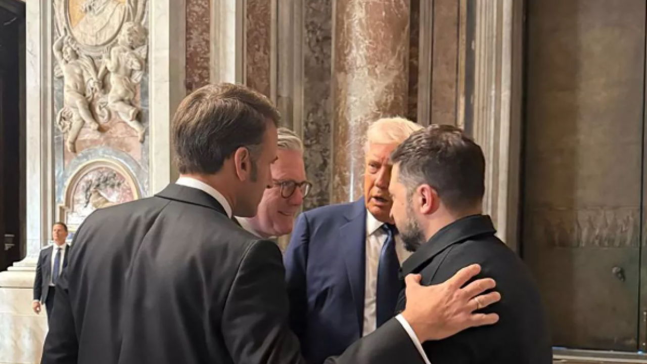 Οι φωτογράφοι κατάφεραν να απαθανατίσουν την έντονη συνάντηση στη Βασιλική του Αγίου Πέτρου καθώς τοποθετήθηκαν δύο καρέκλες για να καθίσουν πρόσωπο με πρόσωπο και να ξεκαθαρίσουν τις διαφορές τους. Ο Γάλλος πρόεδρος Εμανουέλ Μακρόν και ο Κιρ Στάρμερ ήταν κοντά καθώς ξεκίνησε η συνάντησή τους. Αφότου ο Μακρόν αγκάλιασε τον Ζελένσκι, ο Τραμπ τράβηξε τον Γάλλο ηγέτη στο πλάι. Η ειδικός στο διάβασμα των χειλιών Νίκολα Χίκλινγκ είπε ότι ο πρόεδρος των ΗΠΑ στη συνέχεια άπλωσε το χέρι του και στους δύο και τους τράβηξε πιο κοντά.