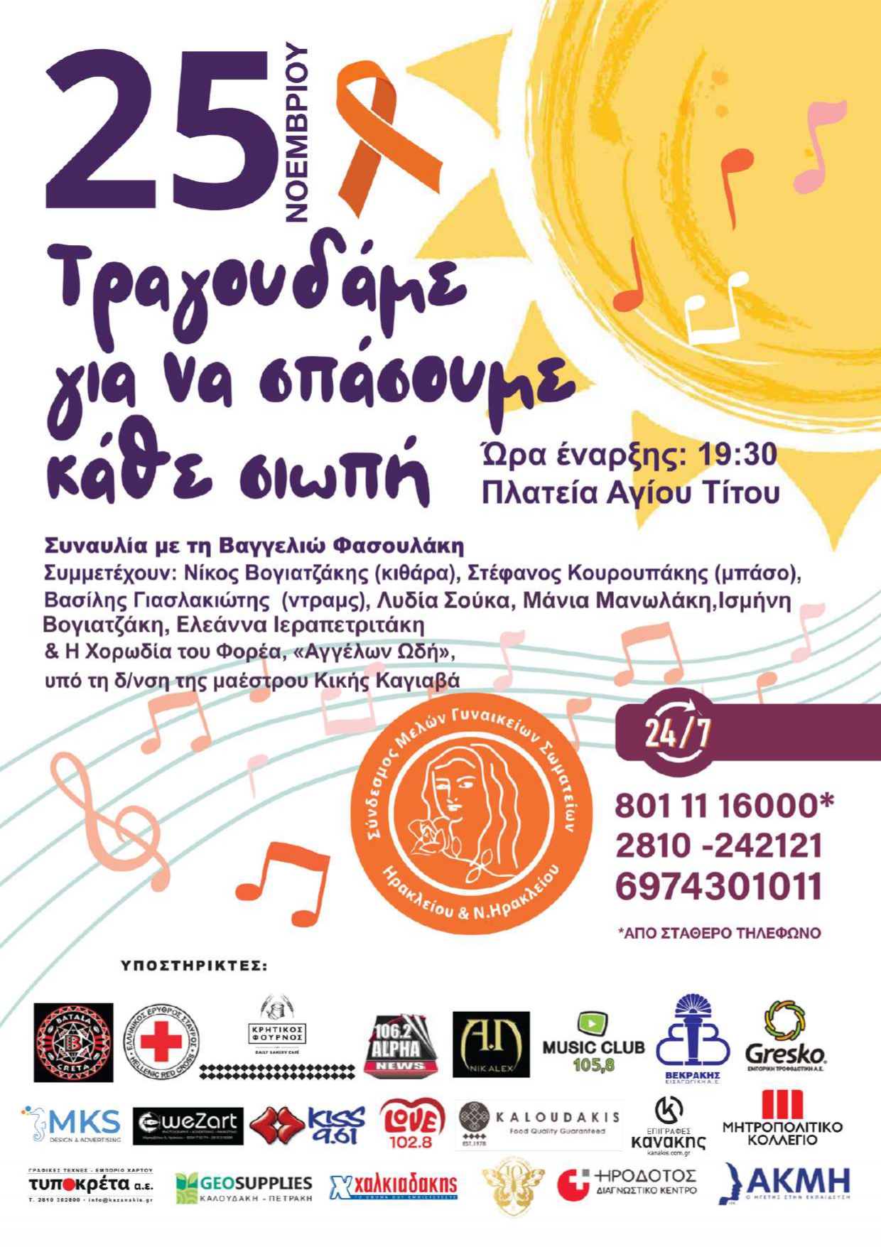 Μέσα από τη δύναμη της μουσικής, που μπορεί να ενώσει τους ανθρώπους και να μεταδώσει μηνύματα πέρα από σύνορα και κάθε μορφής φραγμούς, ο «Σύνδεσμος Μελών Γυναικείων Σωματείων Ηρακλείου και Ν. Ηρακλείου» επιδιώκει να στείλει ένα ηχηρό μήνυμα με αφορμή τη Διεθνή Ημέρα για την Εξάλειψη της Βίας κατά των Γυναικών (25η Νοεμβρίου), πως όλοι θα πρέπει να βρισκόμαστε δίπλα σε κάθε γυναίκα που αντιδρά στην κακοποίηση.