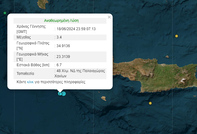 Ακολούθησε σεισμός, στις 02:59, με μέγεθος 3,4 Ρίχτερ και επίκεντρο 48 Χλμ. νοτιοδυτικά της Παλαιοχώρας Χανίων. Το εστιακό βάθος ήταν 6,7 χλιόμετρα.