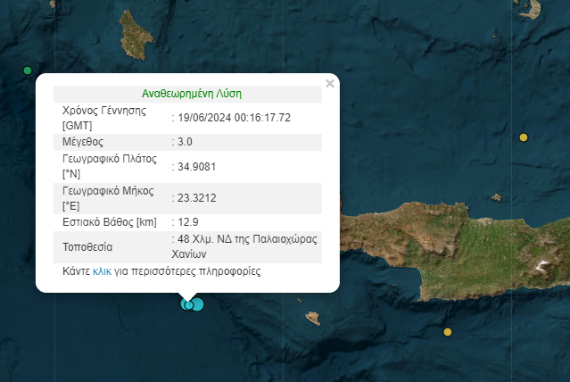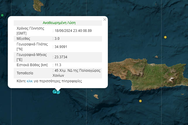 Πιο αναλυτικά, σεισμός 3 Pίχτερ σημειώθηκε στις 02:40 τα ξημερώματα 45 Χλμ. νοτιοδυτικά της Παλαιοχώρας Χανίων. Το εστιακό βάθος του σεισμού υπολογίζεται στα 11,3 χλμ.
