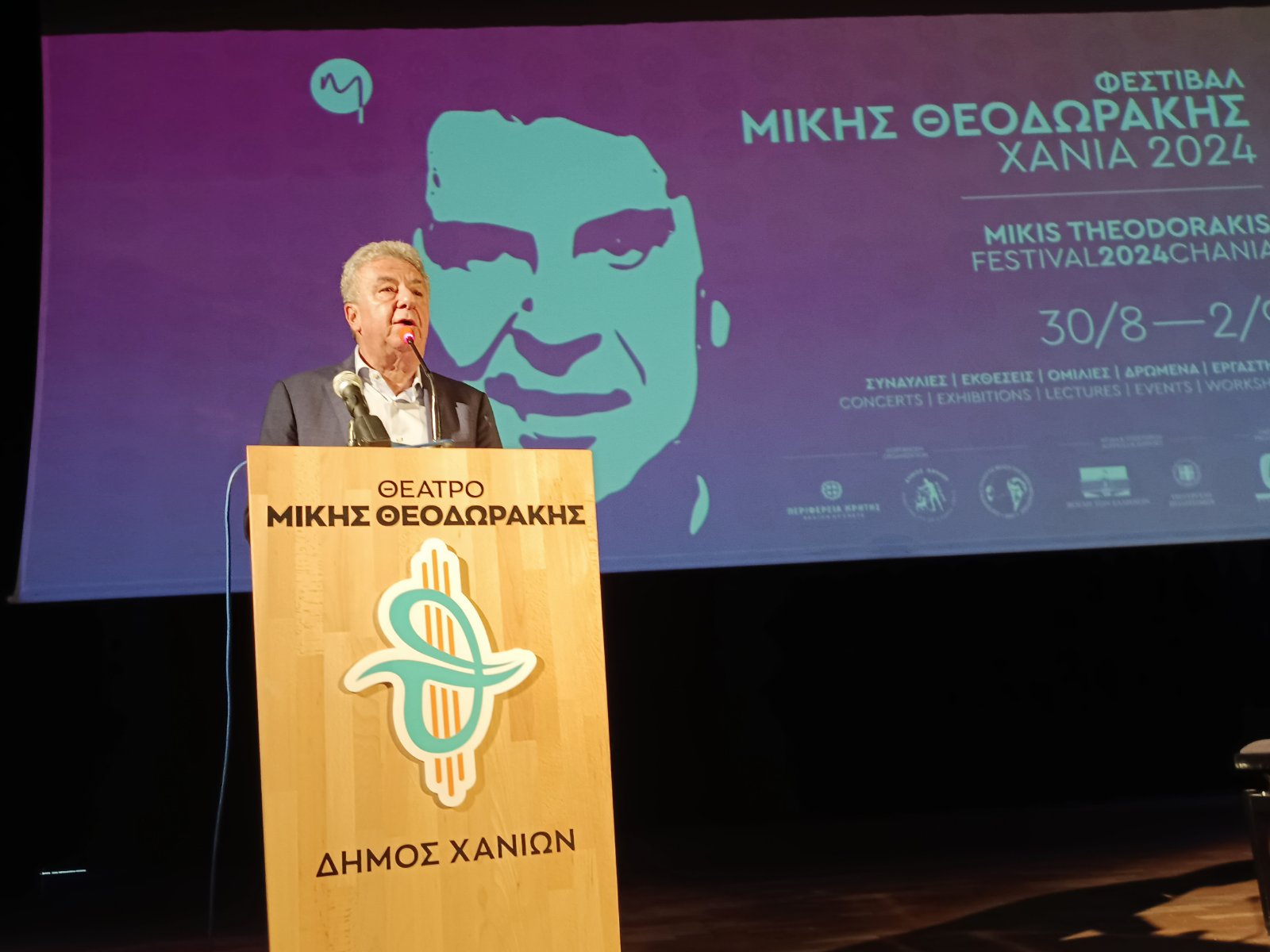 Ο Περιφερειάρχης Κρήτης, Σταύρος Αρναουτάκης κατά τη διάρκεια της ομιλίας του αναφέρθηκε στην σημαντικότητα της προσωπικότητας, του έργου και της προσφοράς του Μίκη Θεοδωράκη στον Πολιτισμό και καλωσορίζοντας τον κεντρικό ομιλιτή, κ. Χριστοδουλίδη, τόνισε: «Με μεγάλη τιμή και χαρά, σας υποδεχόμαστε κ. Πρόεδρε στην Κρήτη. Η παρουσία σας απόψε, υπογραμμίζει τη θεμελιώδη σχέση της Κύπρου με την Κρήτη, όπως αυτή διαμορφώθηκε στο διάβα των αιώνων, αλλά και κυρίως όπως αυτή χαράκτηκε με αίμα το καλοκαίρι του 1974, τότε που οι Κρητικοί υπερασπίστηκαν τα χώματα της Κύπρου, σαν να επρόκειτο για τη γη των δικών τους προγόνων. Η Κύπρος δεν έφυγε ούτε στιγμή από τη σκέψη μου, σε όλη τη διάρκεια της πολυτάραχης ζωής μου», έλεγε ο ίδιος, ο Μίκης τολμώντας να δηλώσει «Έλληνας, Κρητικός, Κύπριος», κατά την τελετή απονομής του παρασήμου από τον τότε Πρόεδρο, Τάσσο Παπαδόπουλο.»