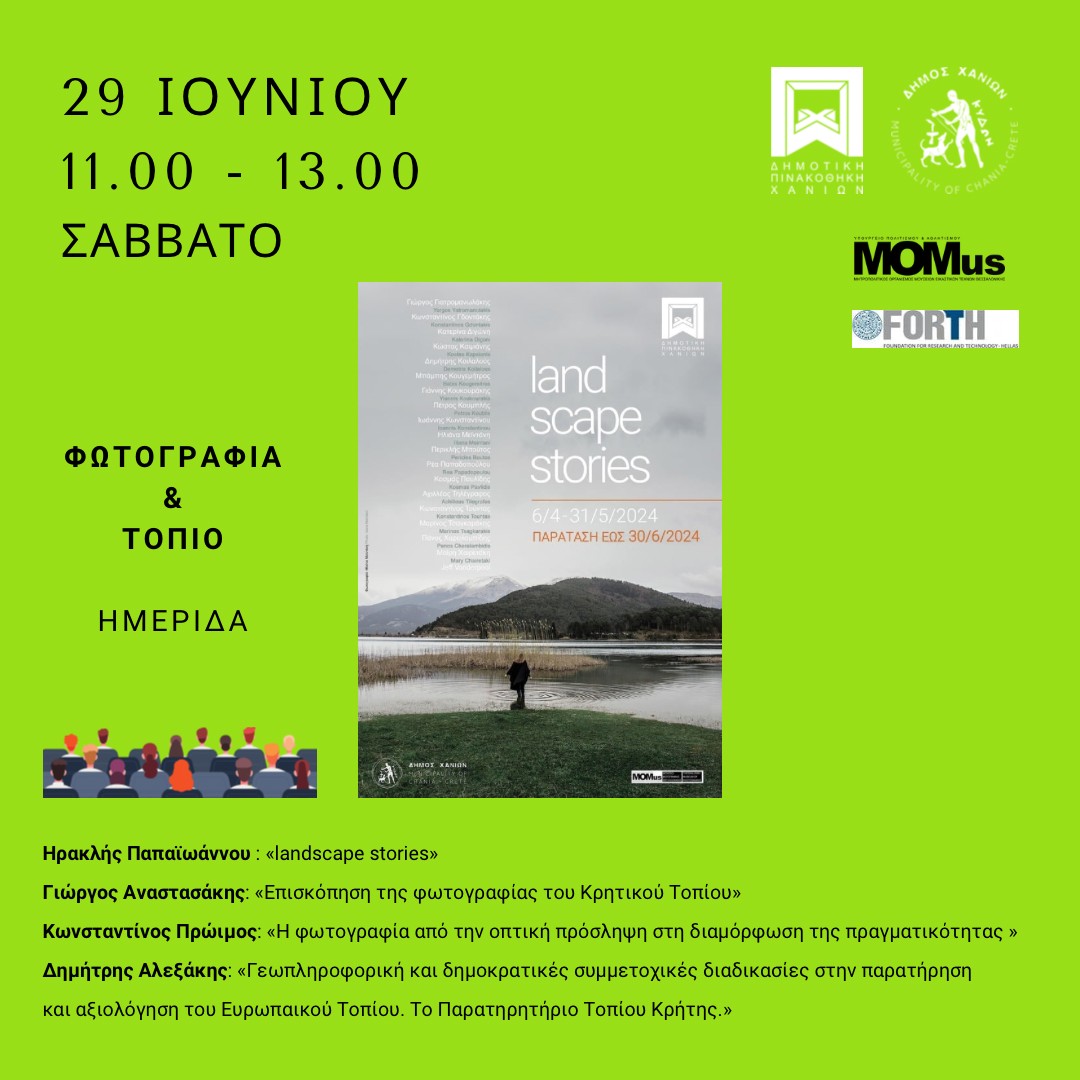 Στο πλαίσιο του δεύτερου κύκλου παράλληλων δράσεων της έκθεσης «landscape stories» η Δημοτική Πινακοθήκη Χανίων σχεδιάζει και υλοποιεί τριήμερο δράσεων με έμφαση στην έκθεση, η οποία ολοκληρώνεται την Κυριακή 30/06. Οι δράσεις που θα πραγματοποιηθούν είναι οι εξής: