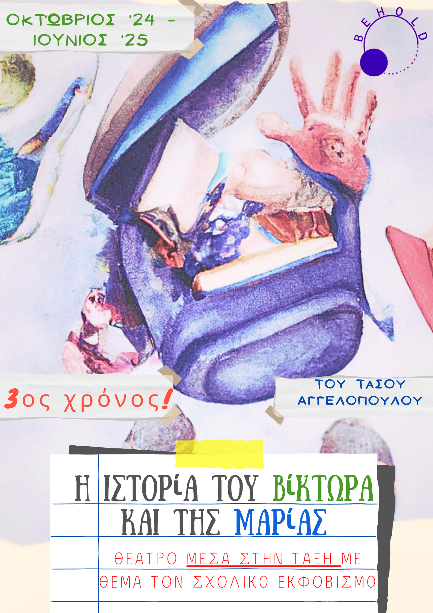 Η Εταιρεία Θεάτρου & Παραστατικών Τεχνών BEHOLD συνεχίζει για 3η σχολική χρονιά τις επισκέψεις της στα σχολεία της Κρήτης με την παράσταση “Η ιστορία του Βίκτωρα και της Μαρίας” σε κείμενο του Τάσου Αγγελόπουλου και σκηνοθεσία Ρίας Μεντηλίδου.